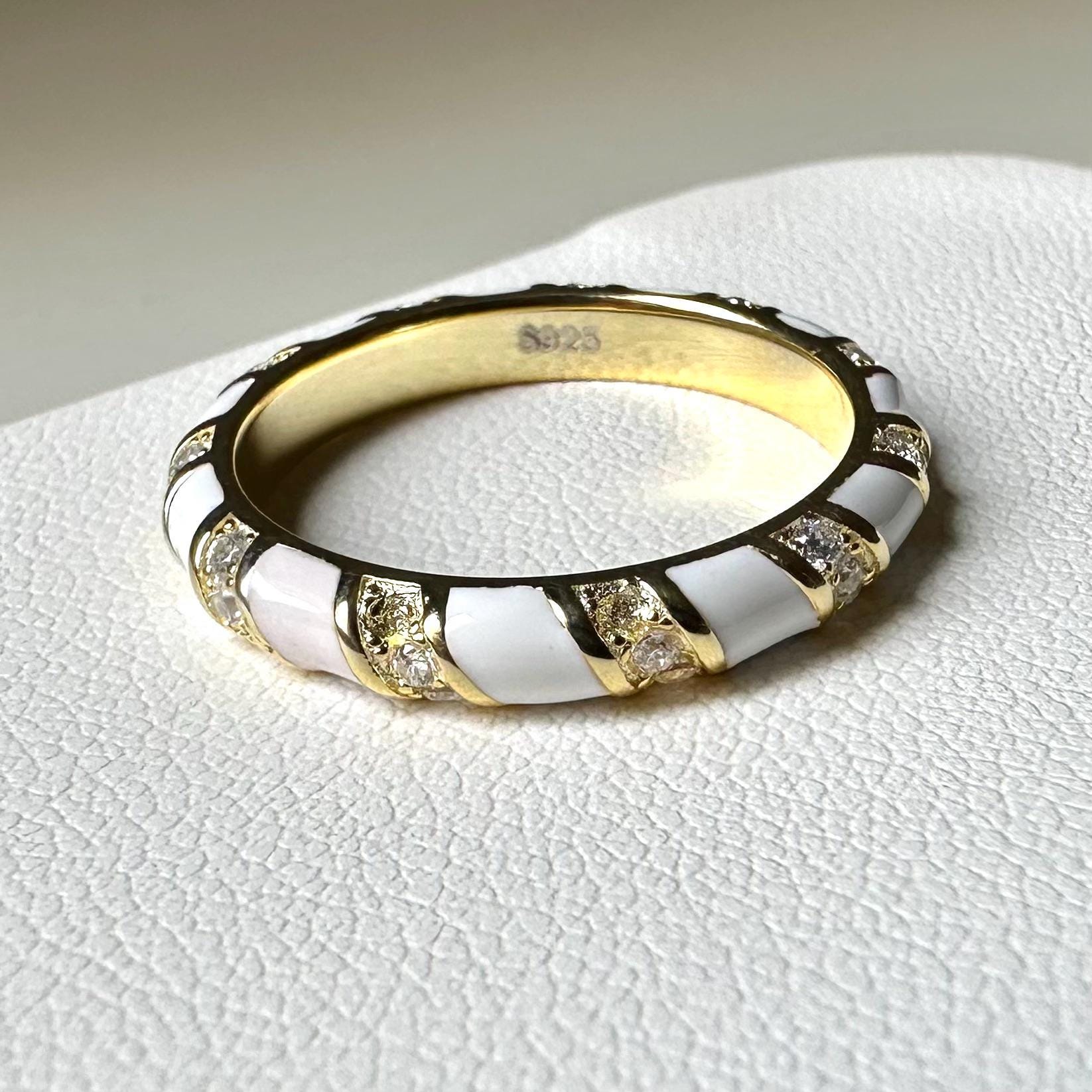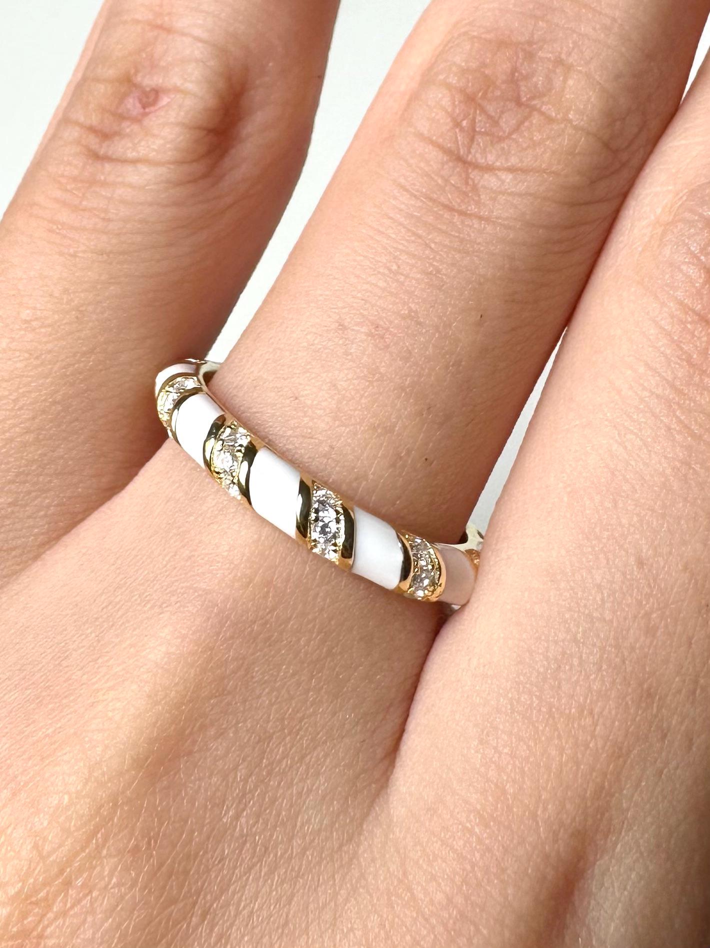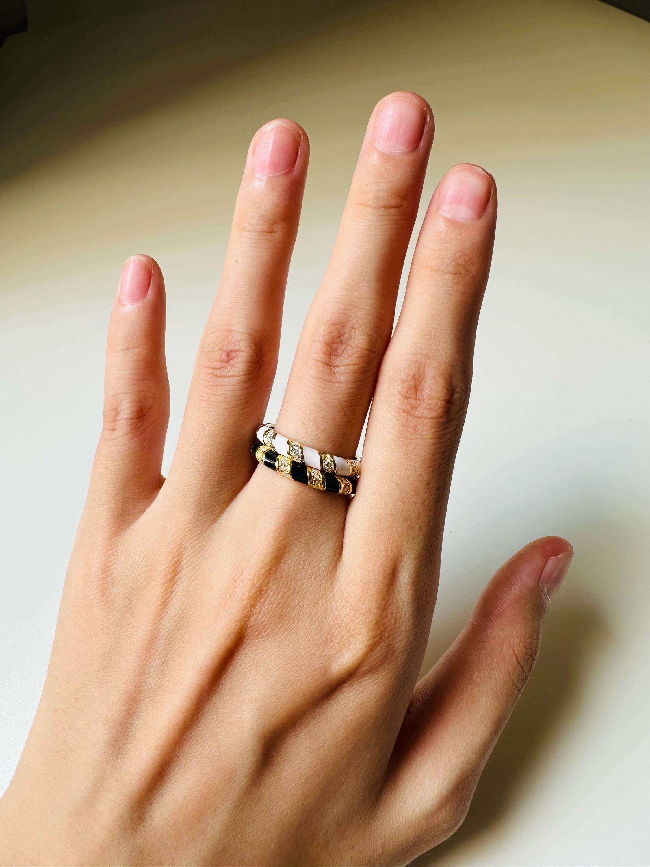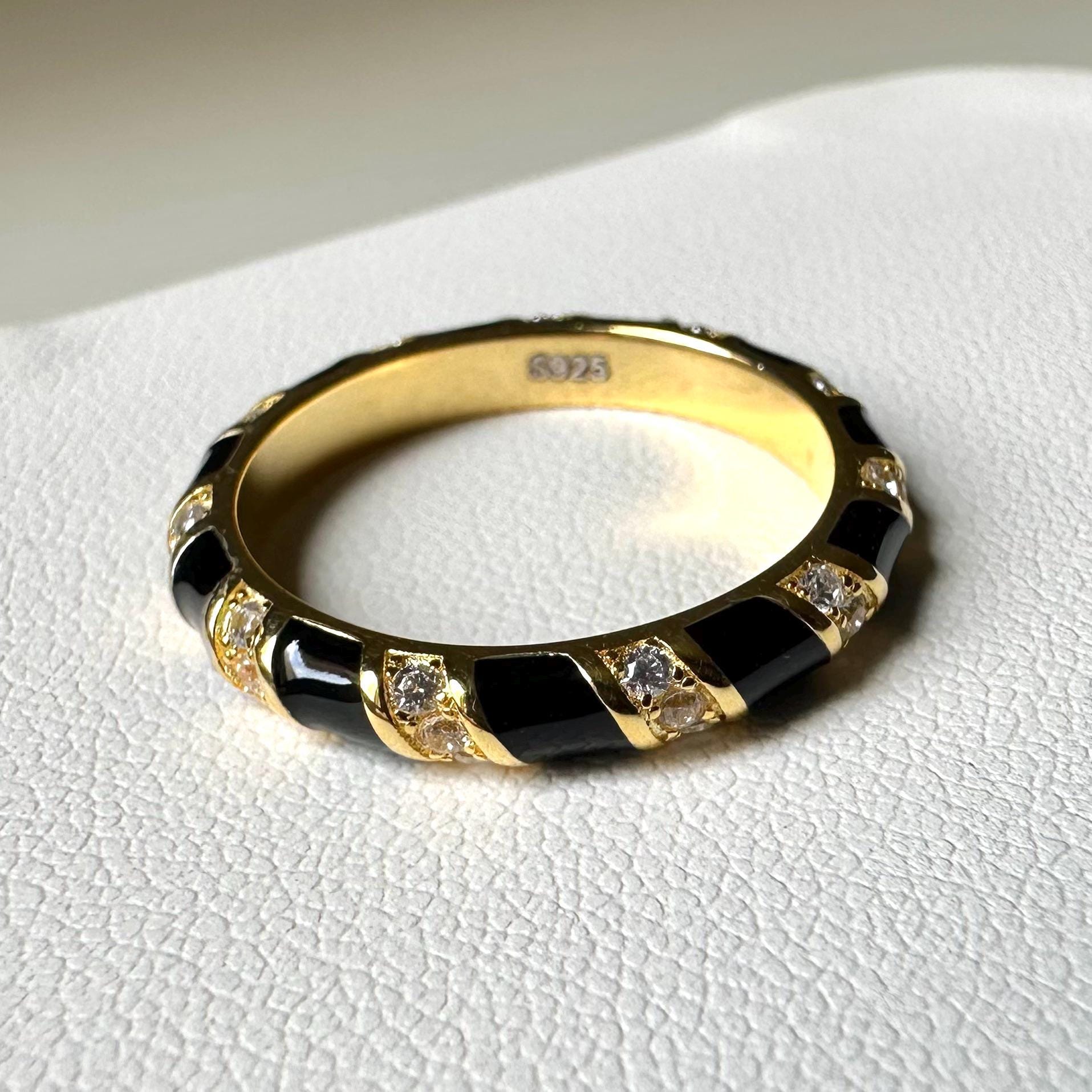 The ring's band is a masterpiece of craftsmanship, with enamel and diamonds alternating in a dynamic spiral pattern. Each segment of enamel is followed by a pavé setting of our 8A grade lab-grown zirconia, known for their superior cut and brilliance.