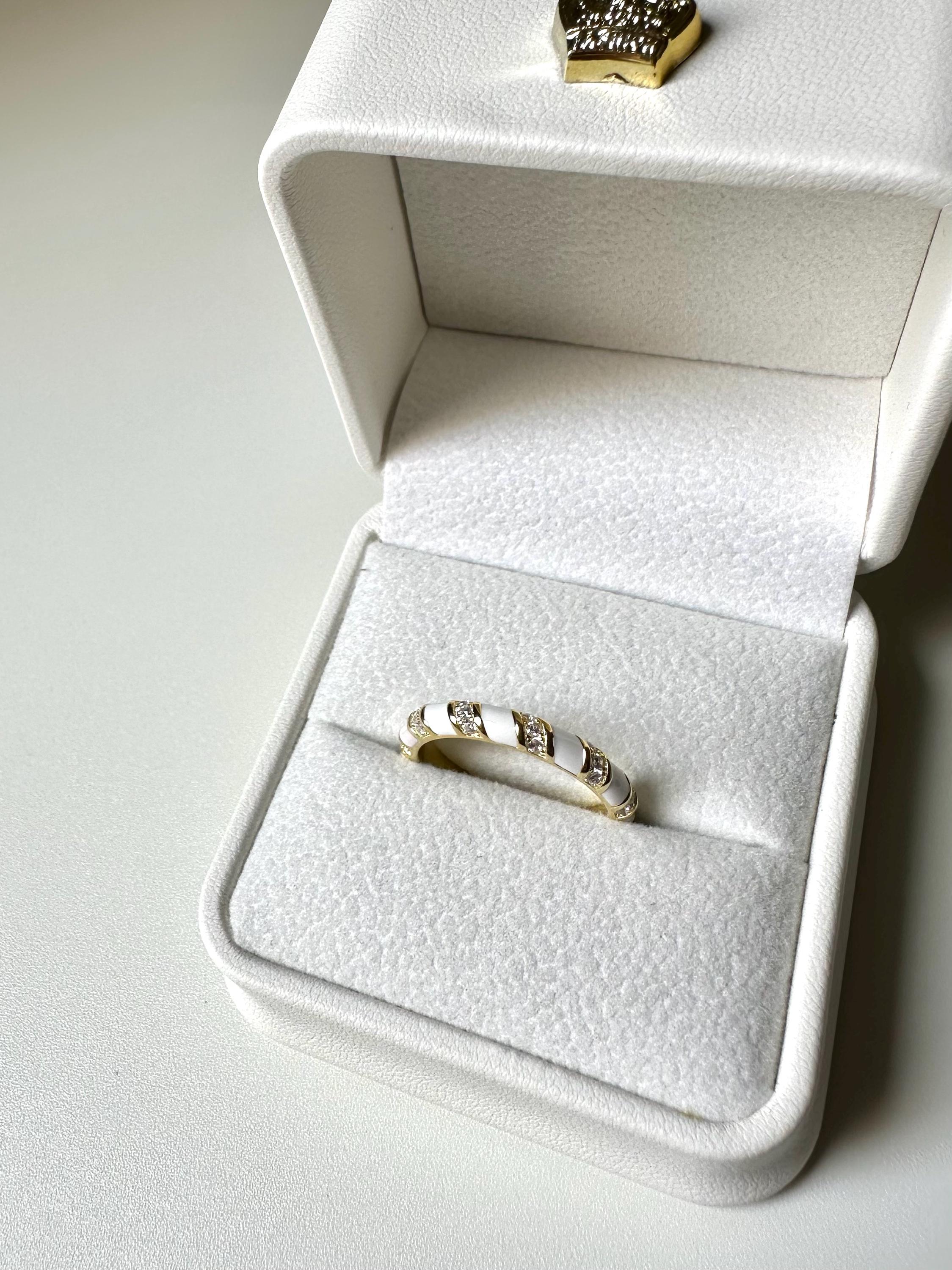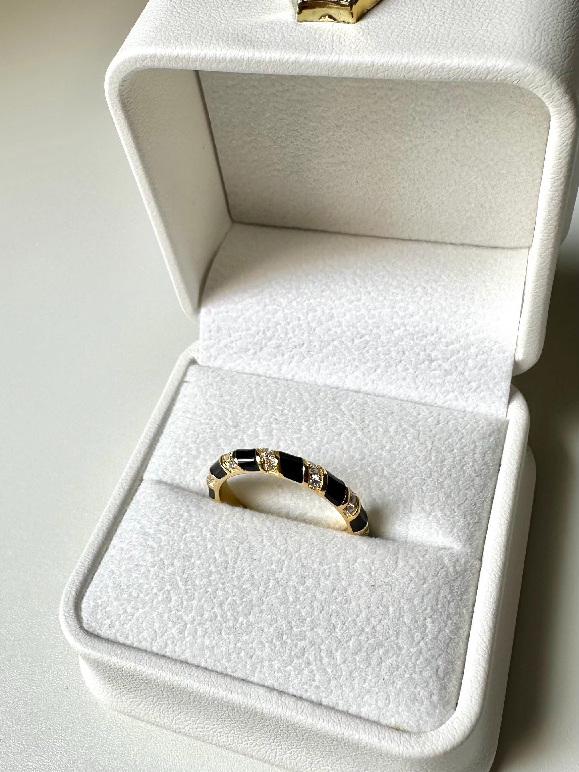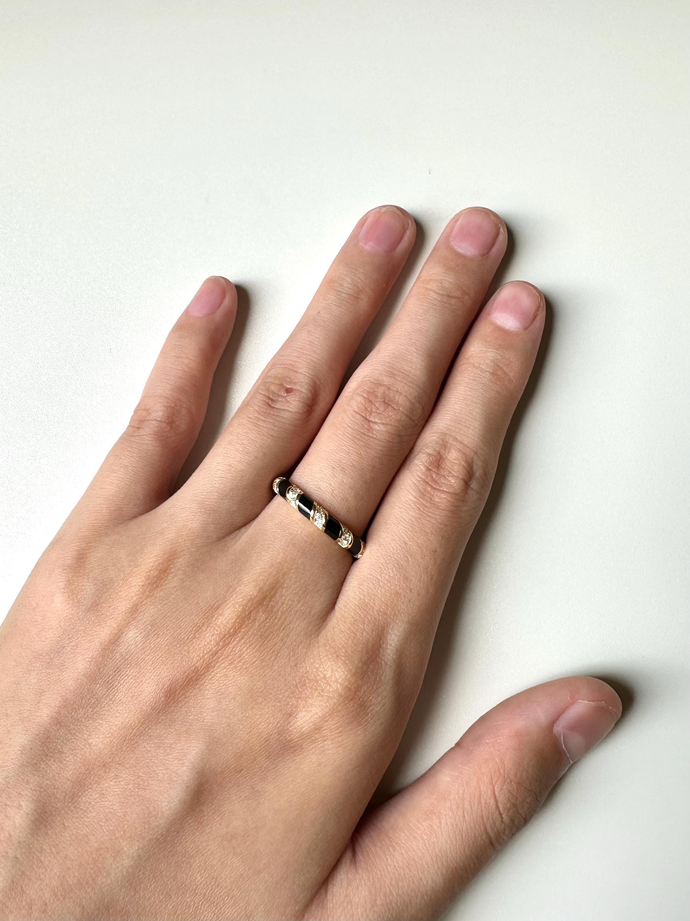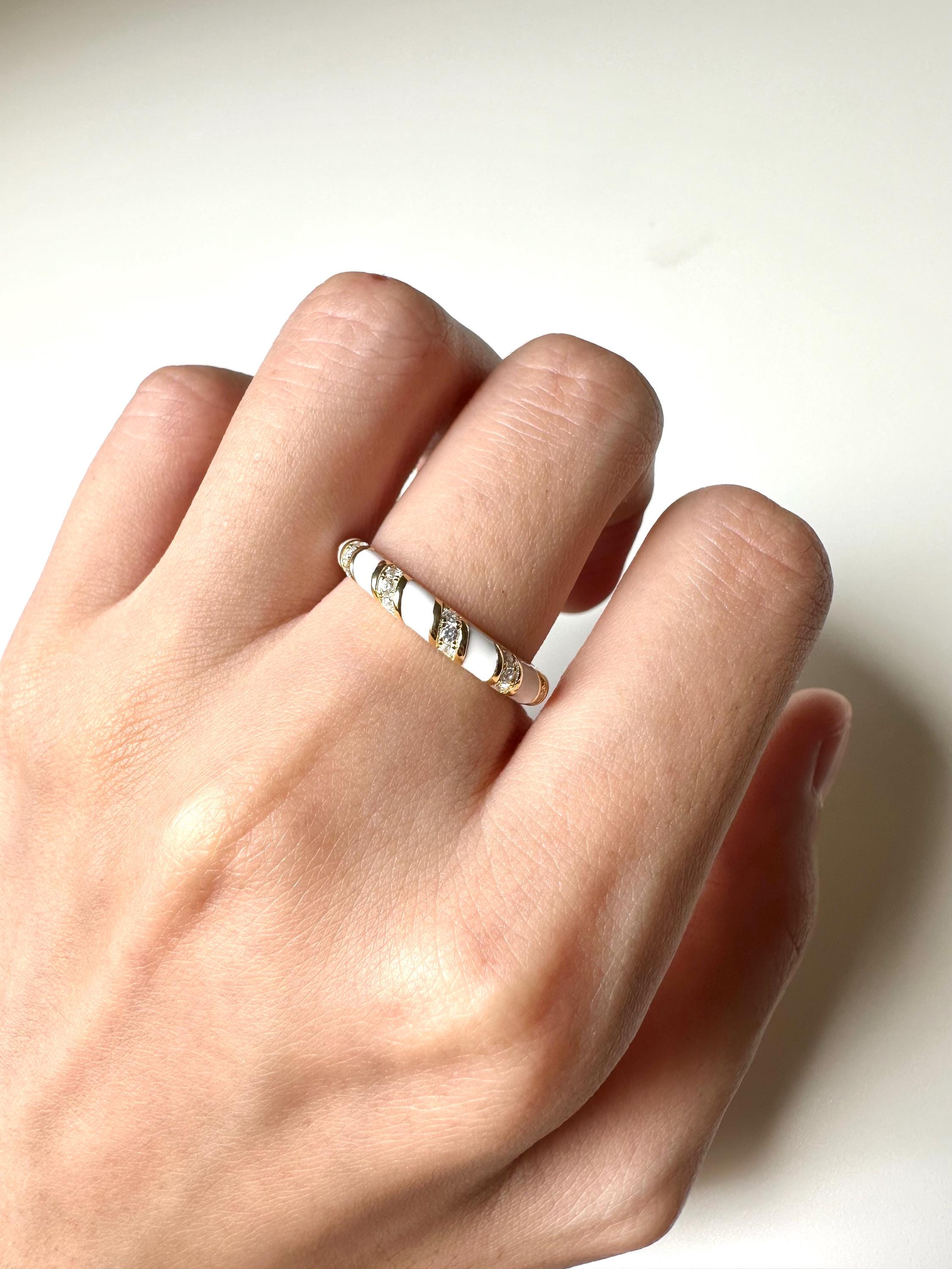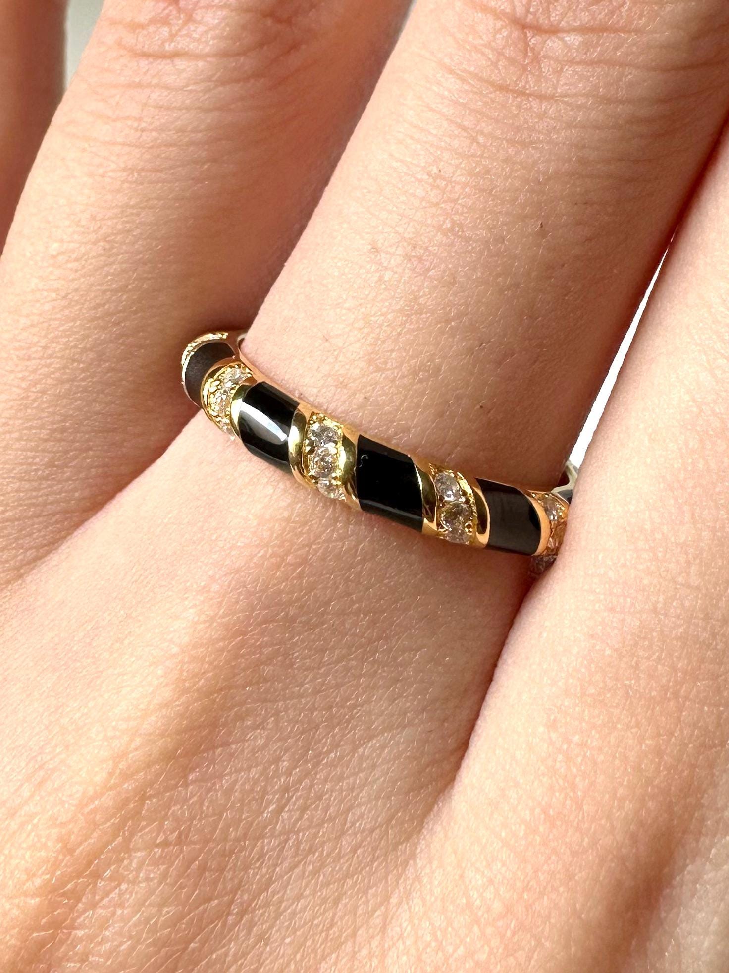 The ring's band is a masterpiece of craftsmanship, with enamel and diamonds alternating in a dynamic spiral pattern. Each segment of enamel is followed by a pavé setting of our 8A grade lab-grown zirconia, known for their superior cut and brilliance.