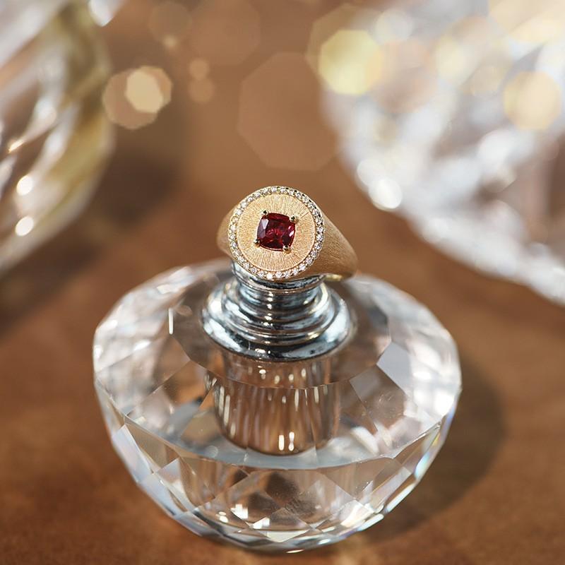 Design Concept: Inspired by the "glorious epitome of the classical royal family", the intense red ruby main stone is placed at the center, just like the core of a royal emblem, symbolizing preciousness and honor. Surrounded by a halo of diamonds, it resembles a radiant aura. The frosted gold ring band replicates the understated luxury of classical jewelry, blending modern techniques to make this ring a wearable "royal keepsake". It is perfect for those who pursue a noble and classic style and wish to show off their unique taste and extraordinary charm.