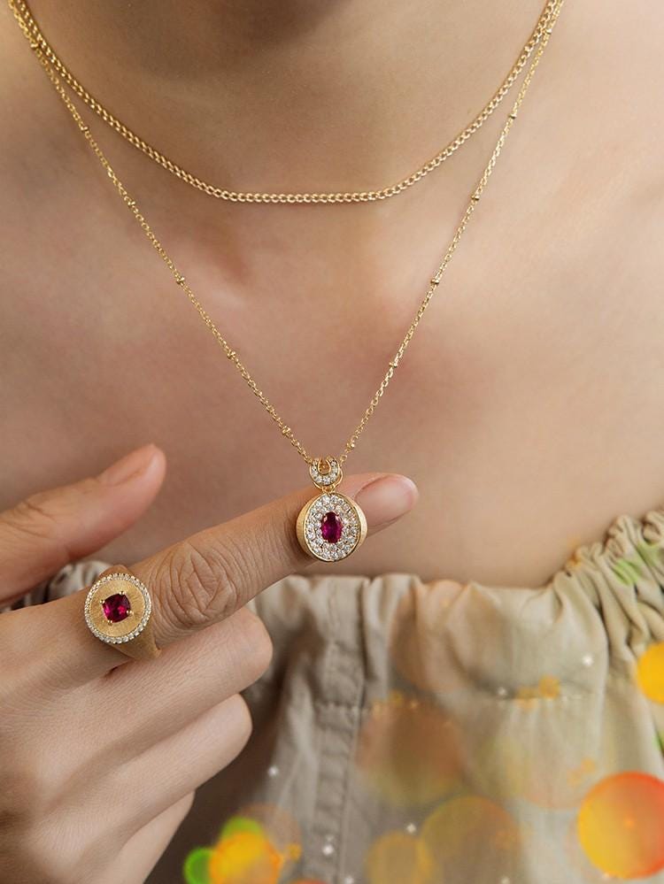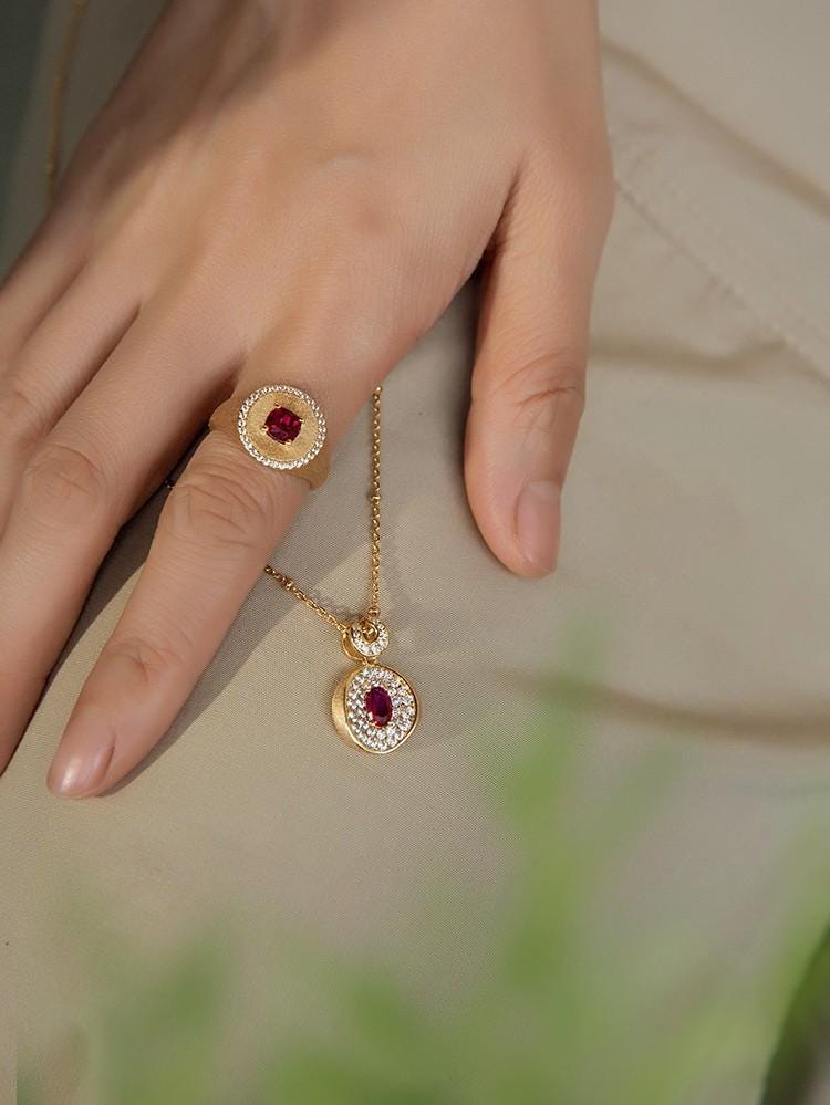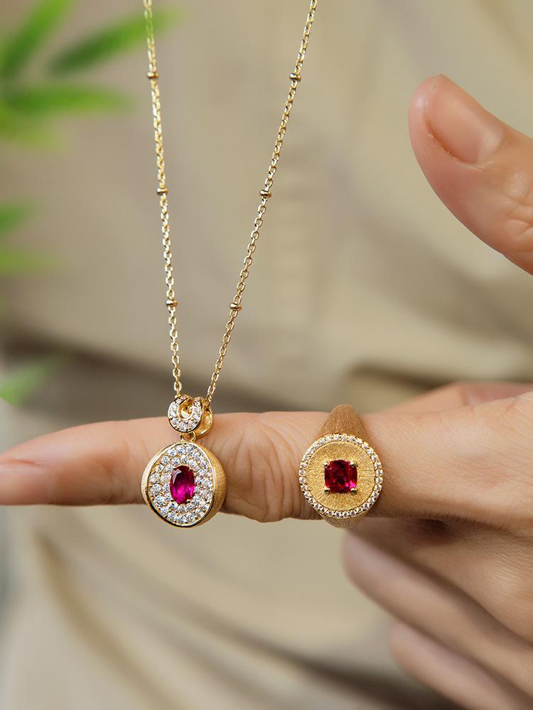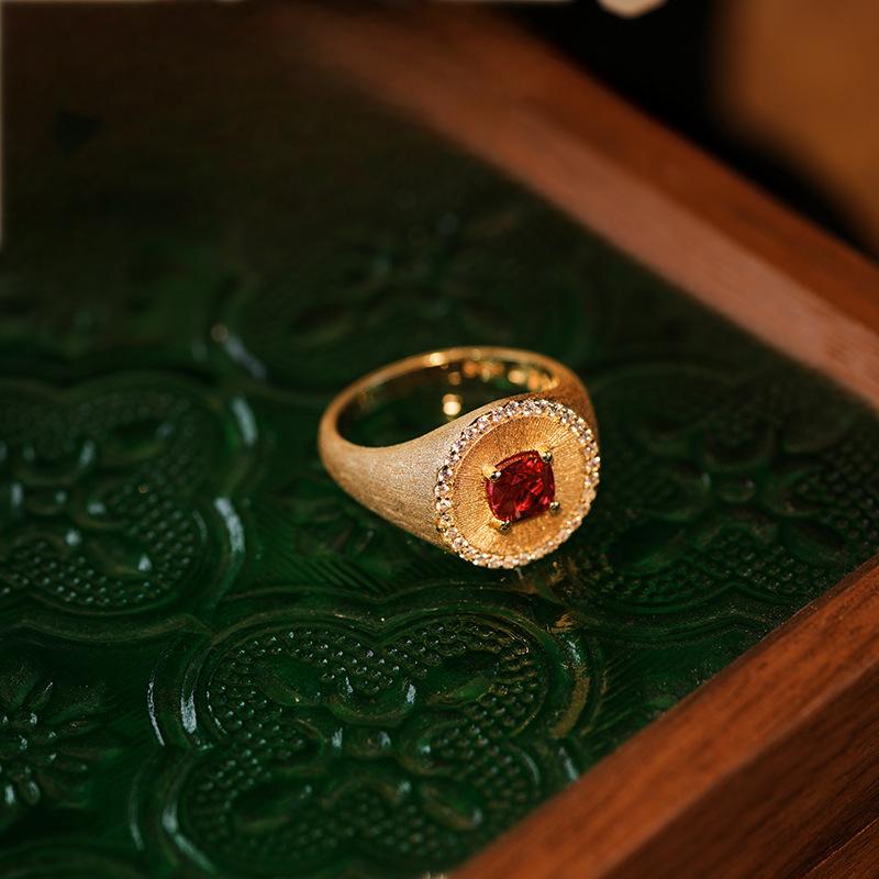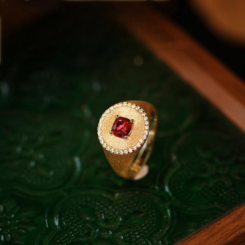 Advantages: 1. Eye - catching Visual Focus: The rich red ruby main stone is highly captivating, and the diamond halo enhances its opulence. The frosted gold band adds a layer of vintage charm, making it unforgettable and easily becoming the highlight of your outfit. 2. Double - guaranteed Craftsmanship: The micro - set diamonds are firmly in place and appear larger. The frosted gold process, after fine polishing, is resistant to fingerprints and scratches, maintaining its delicate appearance over time. 3. High Style Compatibility: Its classical royal style is suitable for formal occasions, and due to its refined design, it can also blend seamlessly into daily fashionable looks, fulfilling diverse style needs.