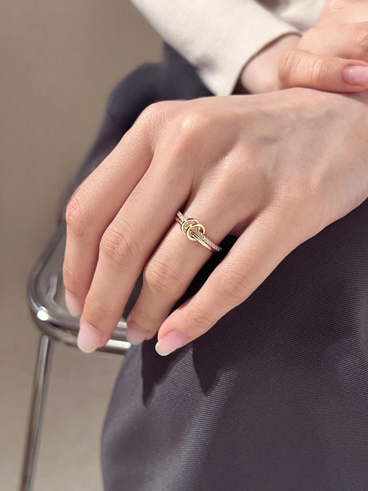 Taking classic circular elements as the core and integrating modern fashion aesthetics, multiple layers of gold rings are interwoven and wrapped, symbolizing the bond and continuation of emotions. The inlaid diamonds are dotted like stars, symbolizing shining and precious moments. The overall design aims to convey eternal, romantic, and unique personality charm through simple and layered lines, making the ring a carrier of emotions and style.