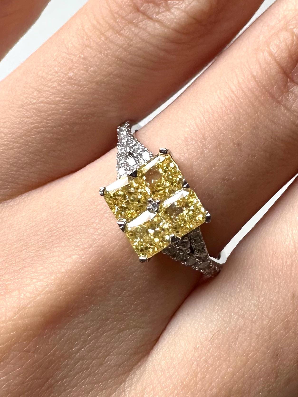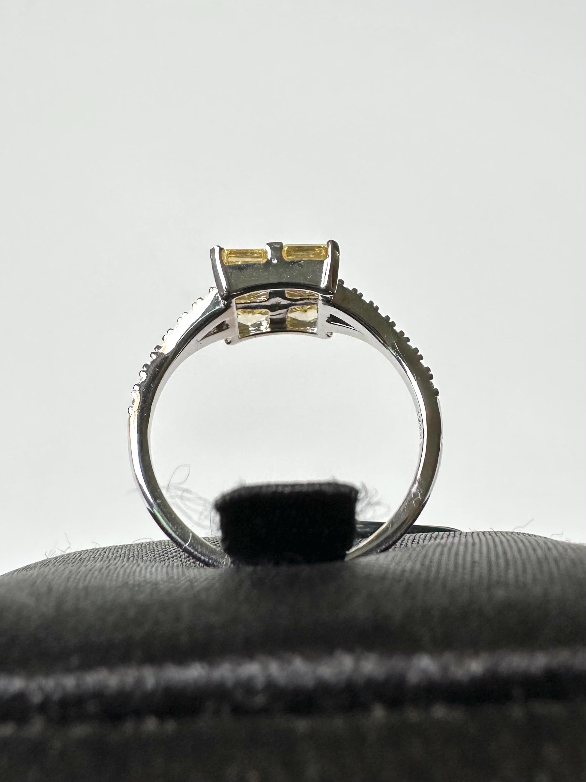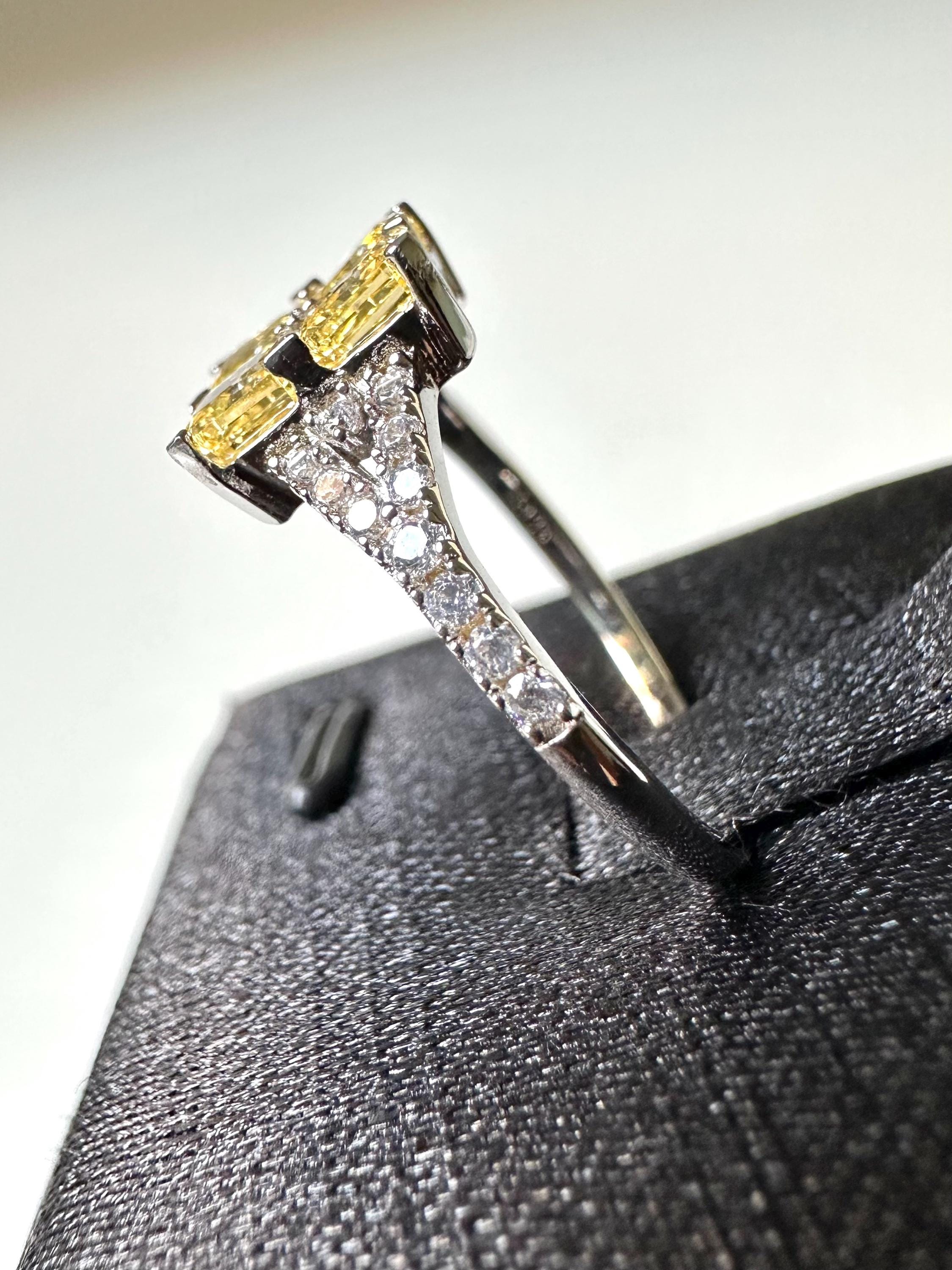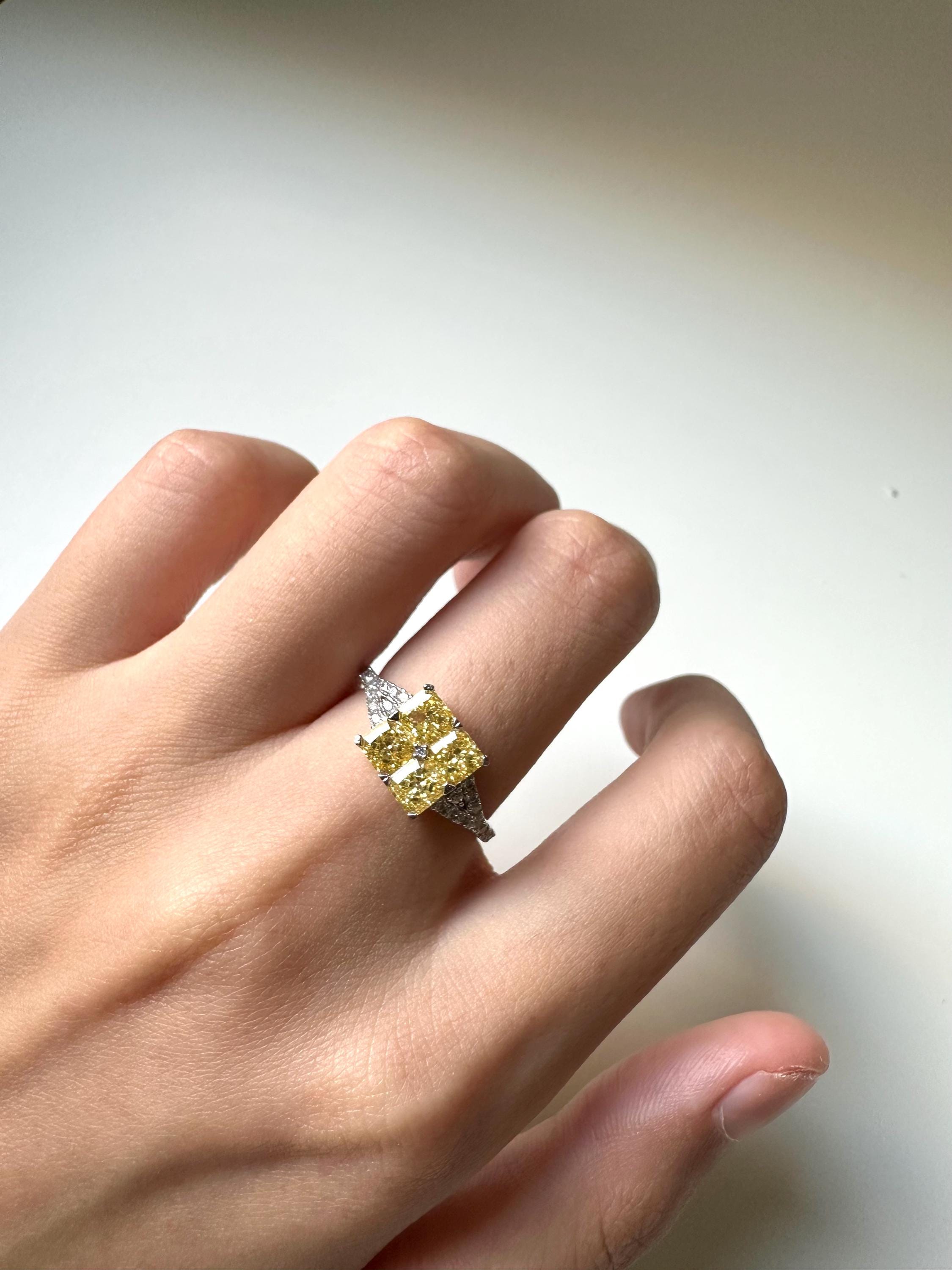 Product Design Concept Taking yellow diamonds as the protagonist, with their rich color and unique texture, a symmetrical and tense visual center is constructed, complemented by white diamonds and yellow diamond, as if casting the sunset glow and dazzling starlight on the ring surface. By integrating the bold splicing of modern art with the luxurious genes of classic jewelry, we aim to create jewelry pieces that break through conventions, showcase individuality, and carry unique aesthetics and emotions.