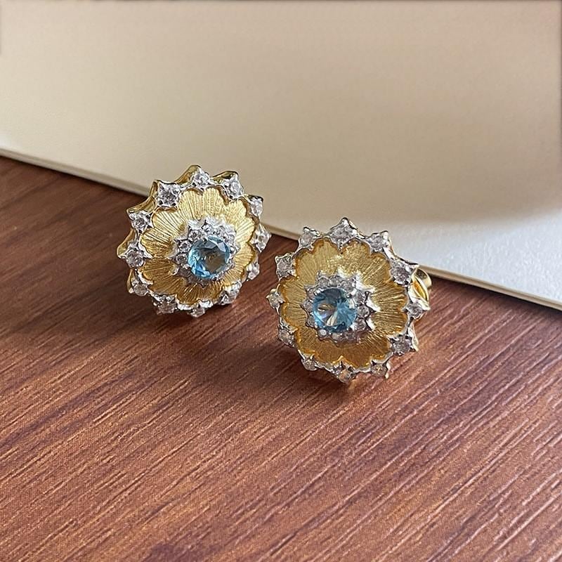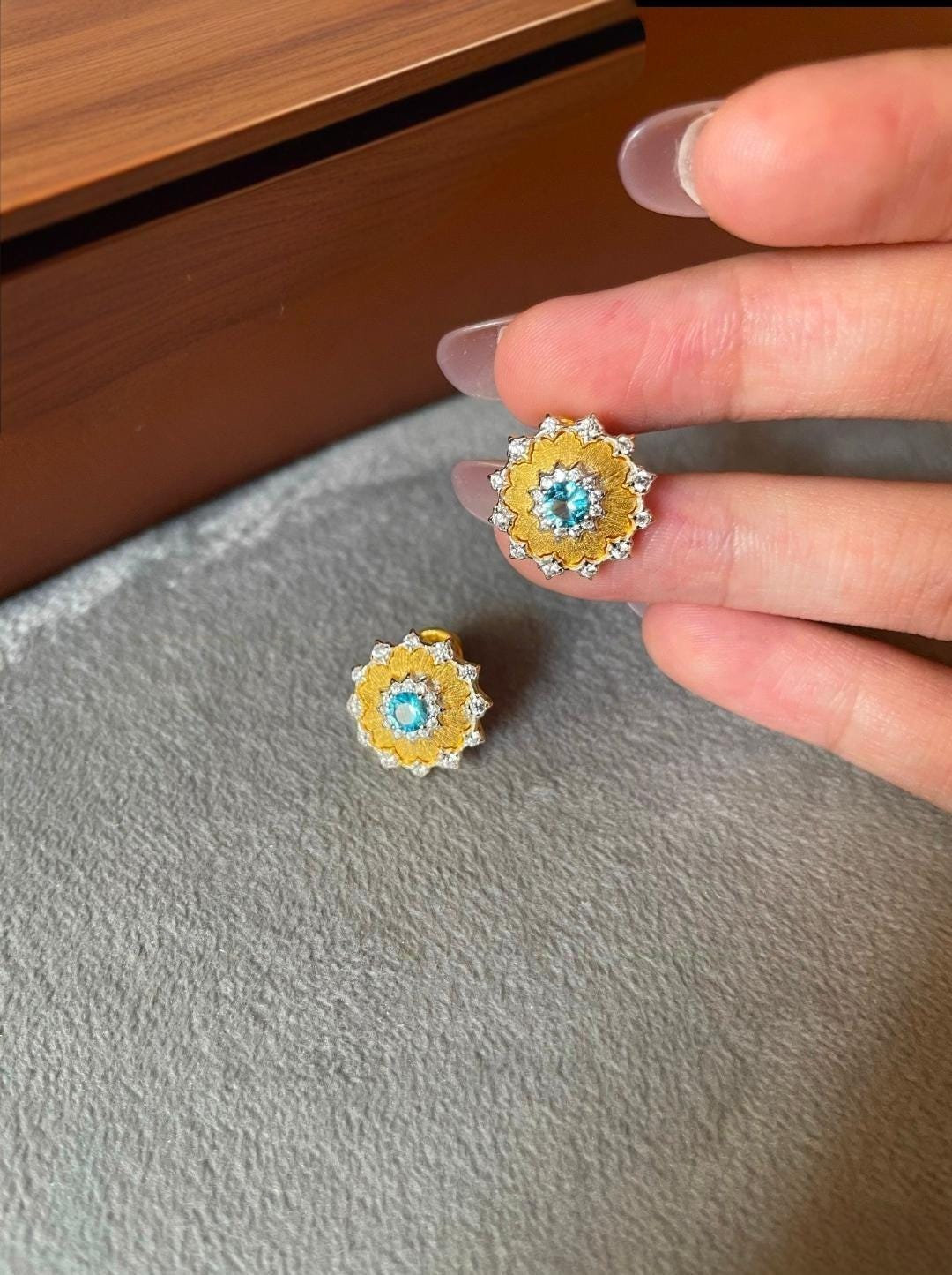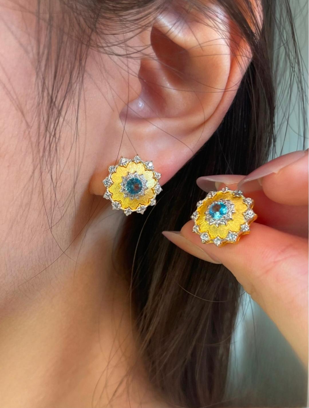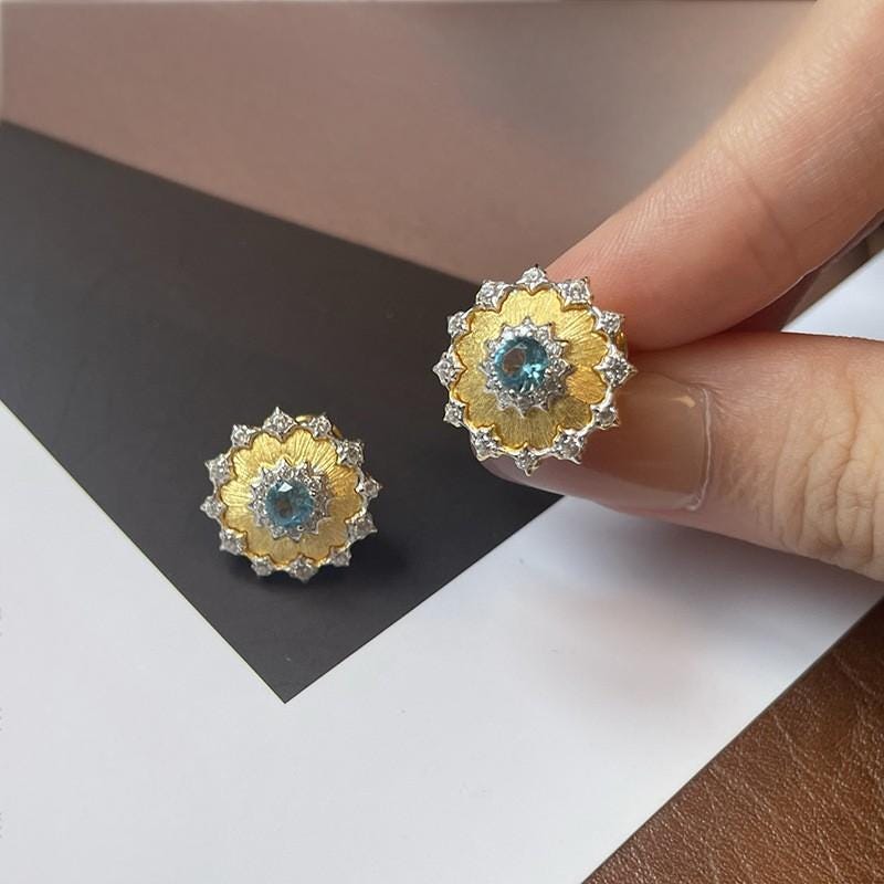 Product design concept These stud earrings are designed with the concept of "Flowers of Nature Meets Brilliant Stars". Inspired by blooming flowers, the texture of the petals is shaped by delicate craftsmanship, presenting a natural and agile beauty. The blue gemstones set in the center are like dewdrops condensed in the stamens of flowers, and like the stars shining in the night sky, and the surrounding diamonds simulate starlight, creating a dreamy and vibrant atmosphere, perfectly blending the softness of nature with the brilliance of jewelry, aiming to bring the wearer a romantic experience like being under the starry sky in the garden, so that every wear becomes a tribute to the beauty of nature and the pursuit of exquisite life.