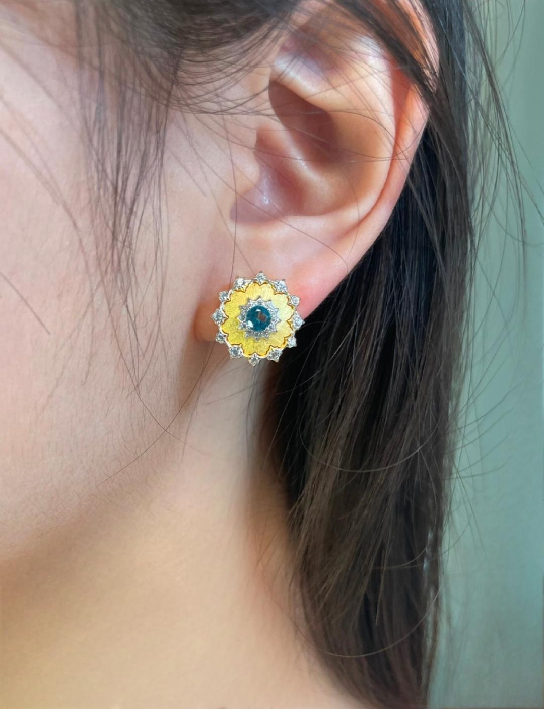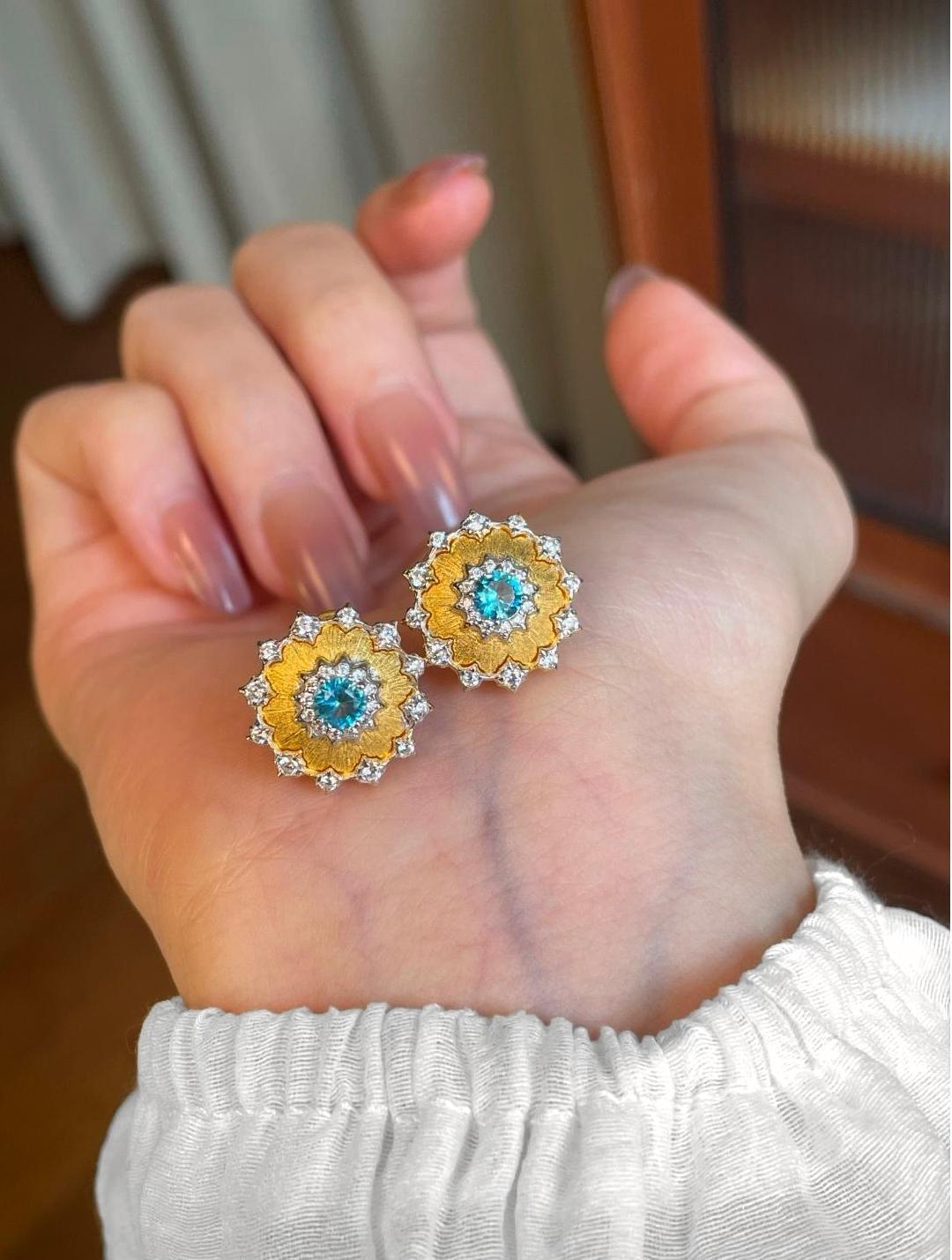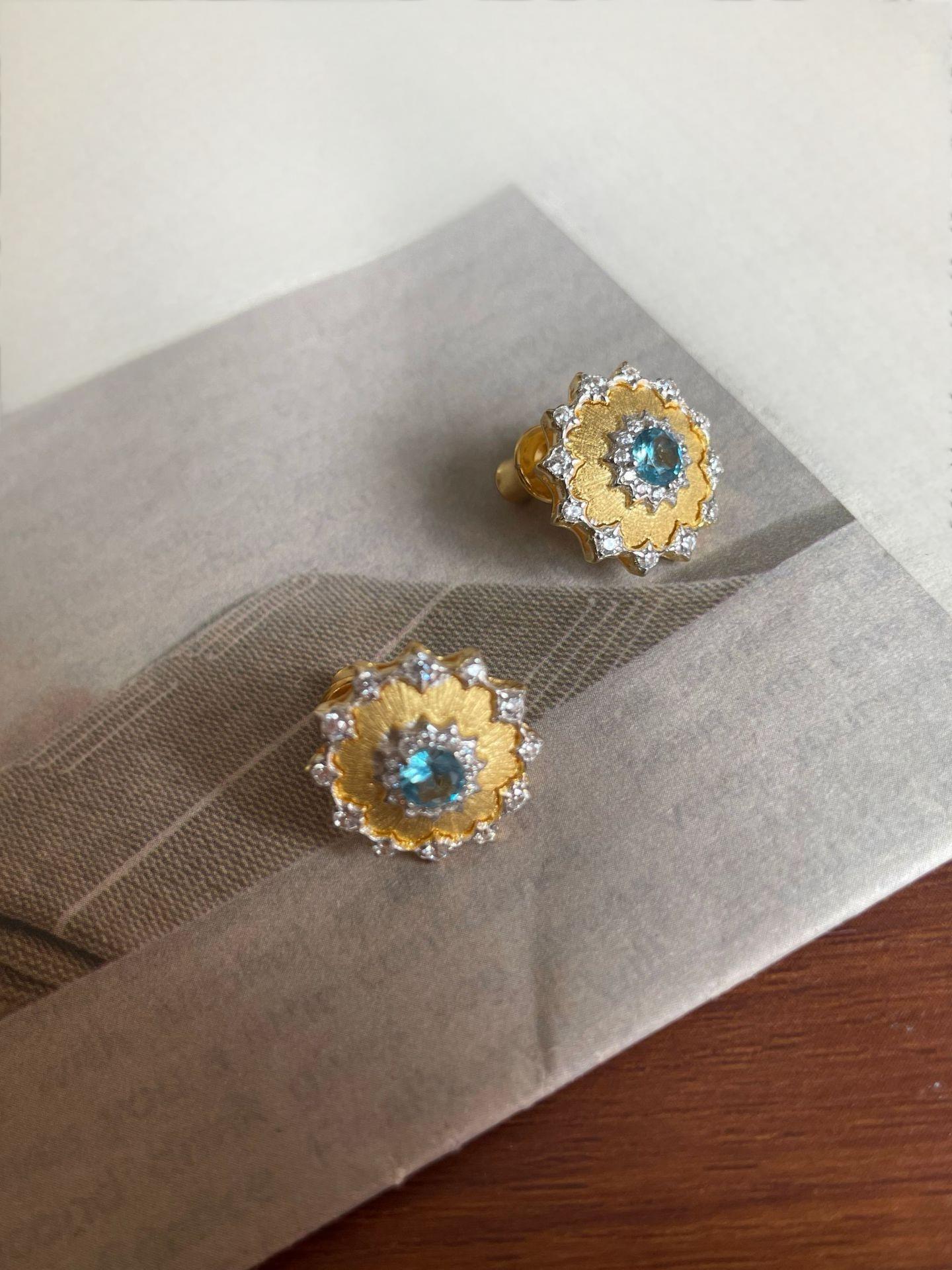 Product design concept These stud earrings are designed with the concept of "Flowers of Nature Meets Brilliant Stars". Inspired by blooming flowers, the texture of the petals is shaped by delicate craftsmanship, presenting a natural and agile beauty. The blue gemstones set in the center are like dewdrops condensed in the stamens of flowers, and like the stars shining in the night sky, and the surrounding diamonds simulate starlight, creating a dreamy and vibrant atmosphere, perfectly blending the softness of nature with the brilliance of jewelry, aiming to bring the wearer a romantic experience like being under the starry sky in the garden, so that every wear becomes a tribute to the beauty of nature and the pursuit of exquisite life.