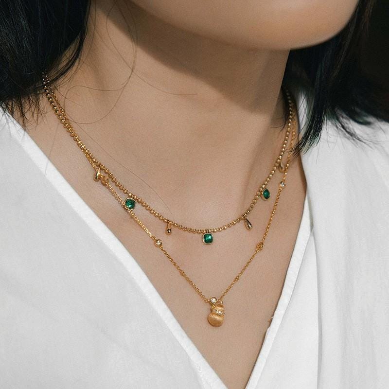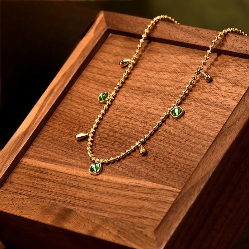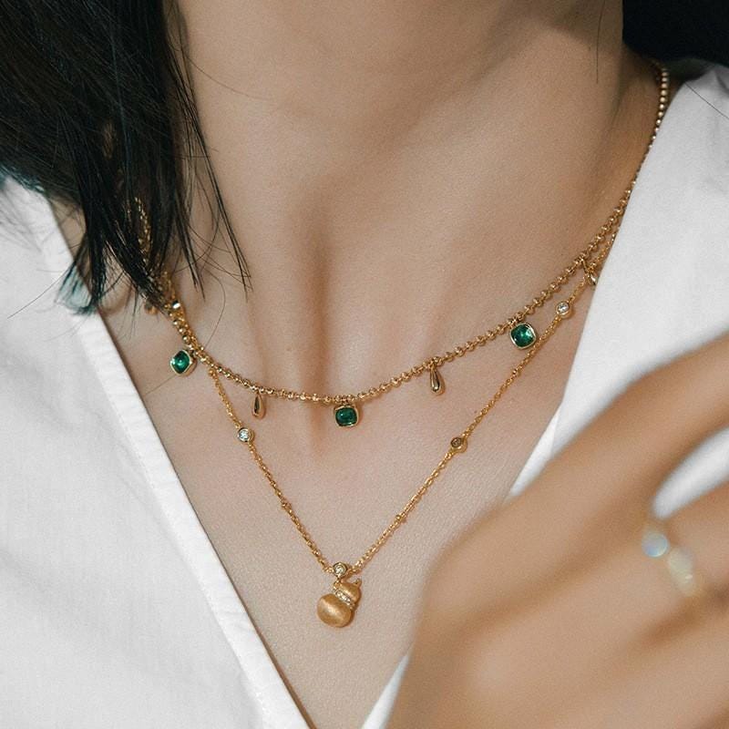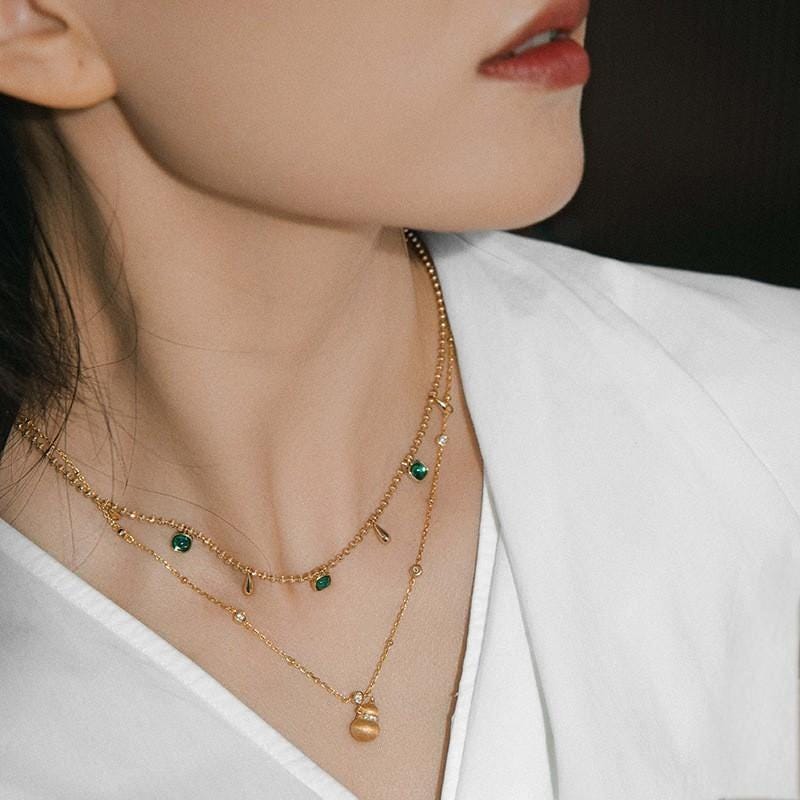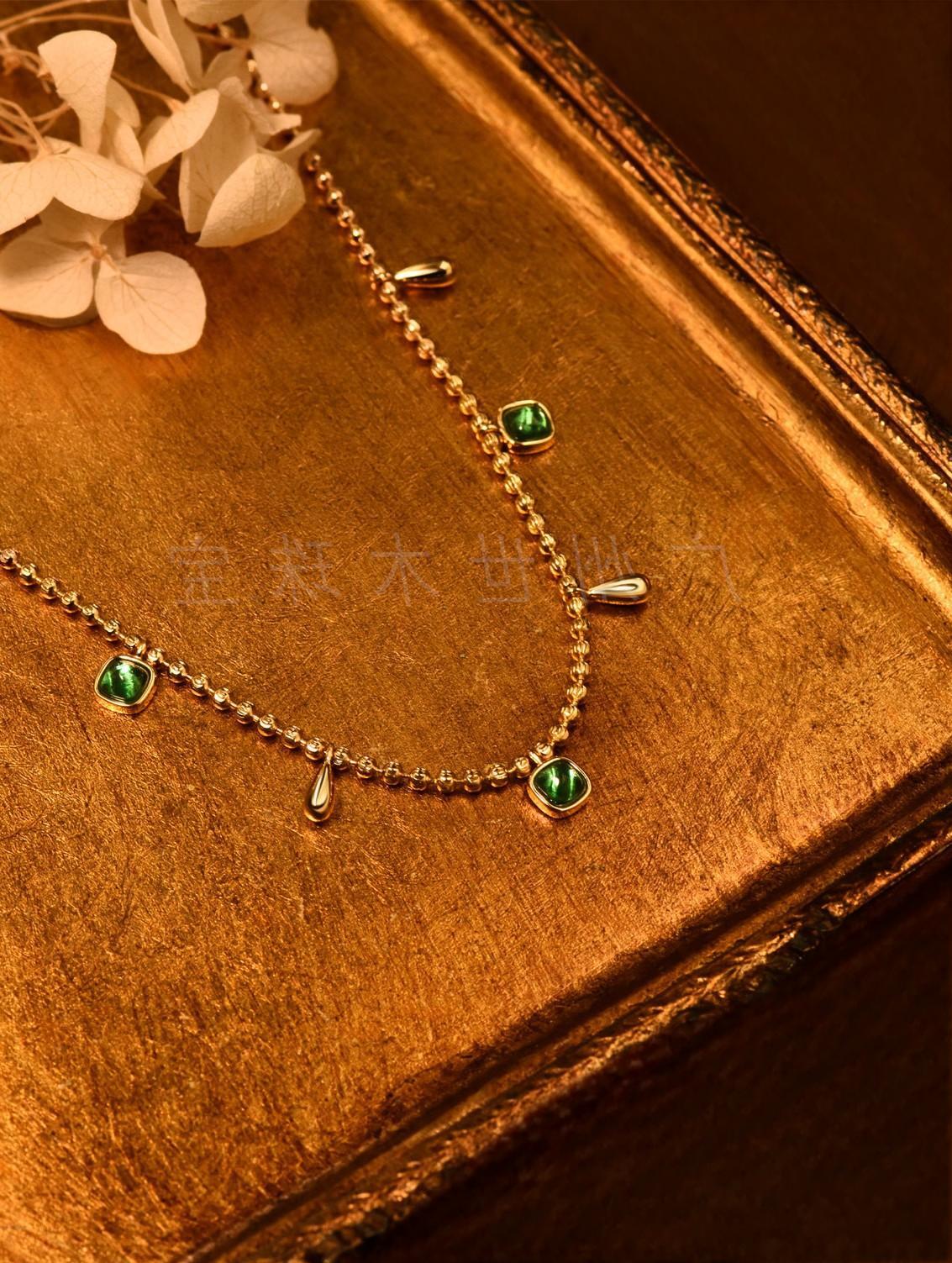Product design concept The design concept is "the fusion of natural vitality and retro luxury". Inspired by the smart water droplets in nature and the vibrant green gemstones, the combination of water droplets and green gemstones, with a retro gold chain, seems to freeze the fresh vitality of nature and the luxurious elegance of retro on the neck, which not only shows the flexible beauty of natural elements, but also creates a luxurious and artistic atmosphere through the combination of retro gold and gemstones, creating a unique neck landscape with both natural interest and retro style for the wearer.