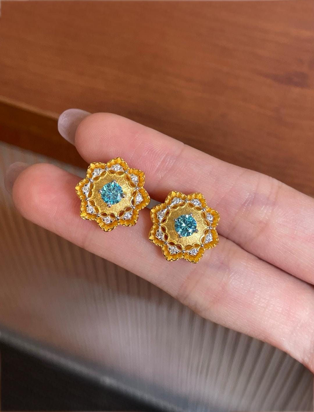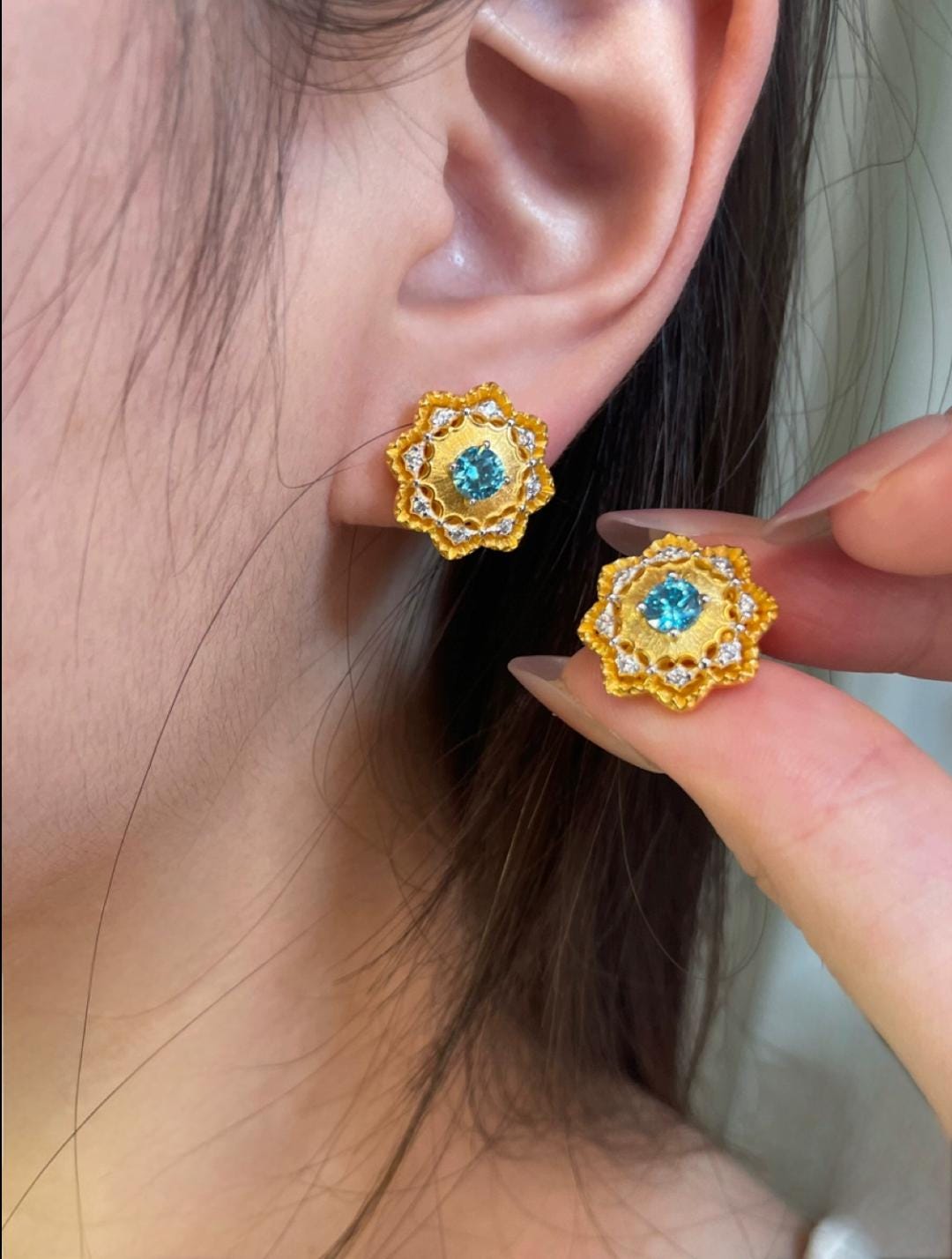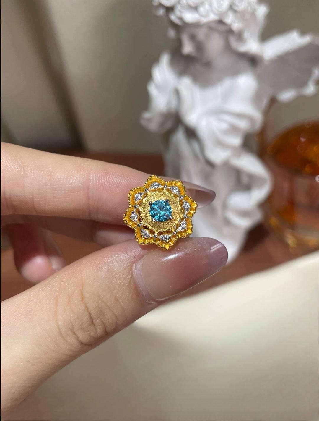 Product design concept The design concept is "symbiosis between oriental poetry and jewelry art". Extract the floral imagery in the traditional oriental patterns, carve the rhythmic petal form through delicate craftsmanship, and convey the gentle beauty of oriental flowers; The blue gemstone in the center resembles the clear color of an oriental ink painting, and the surrounding diamonds are like stars, which not only retains the subtle elegance of oriental aesthetics, but also integrates the brilliance of jewelry, so that the oriental artistic conception quietly reveals in the ears, creating earrings that combine oriental charm and modern sophistication for the wearer.
