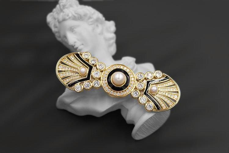 Product design concept The core is the delicate outline of geometric lines and the clever fusion of luxurious materials. Using regular geometric shapes such as fan shapes and circles, with the warmth of pearls, the brilliance of diamonds and the elegance of black and gold color schemes, it injects a sense of modern sophistication into the retro charm, aiming to create accessories with both artistic and noble temperament for the wearer, so that it can become the focus on various occasions, showing a unique fashion taste and the pursuit of exquisite life.