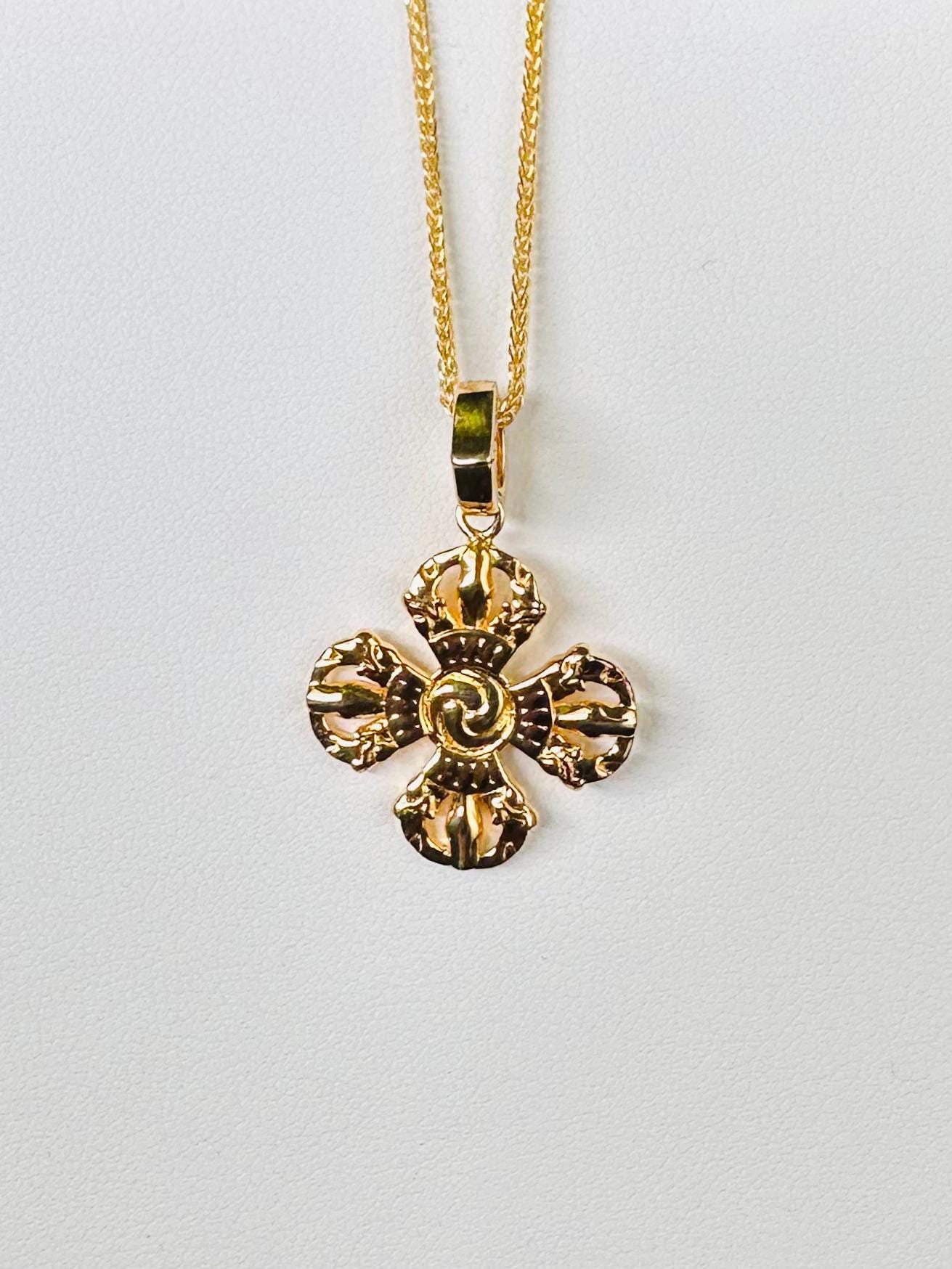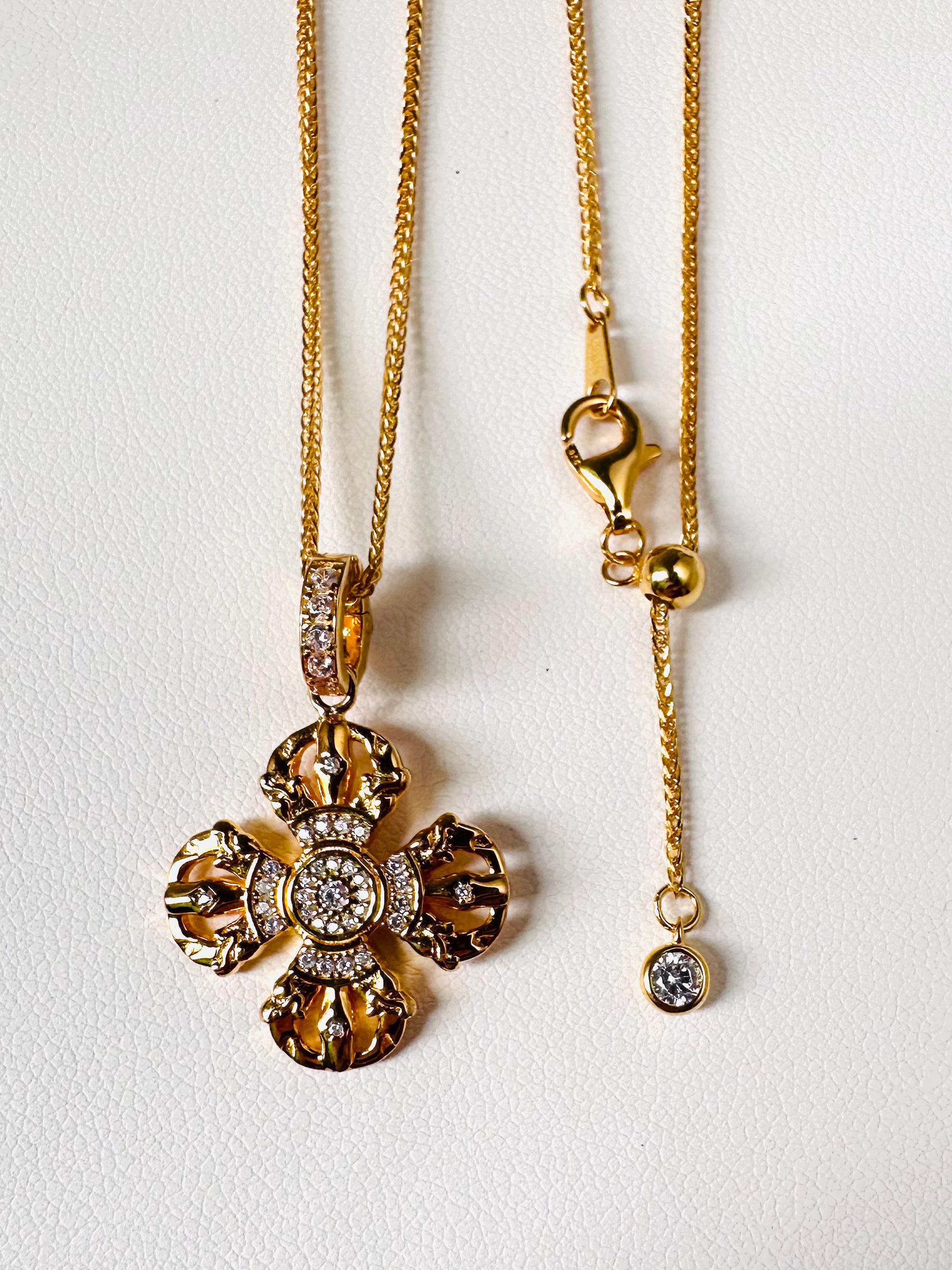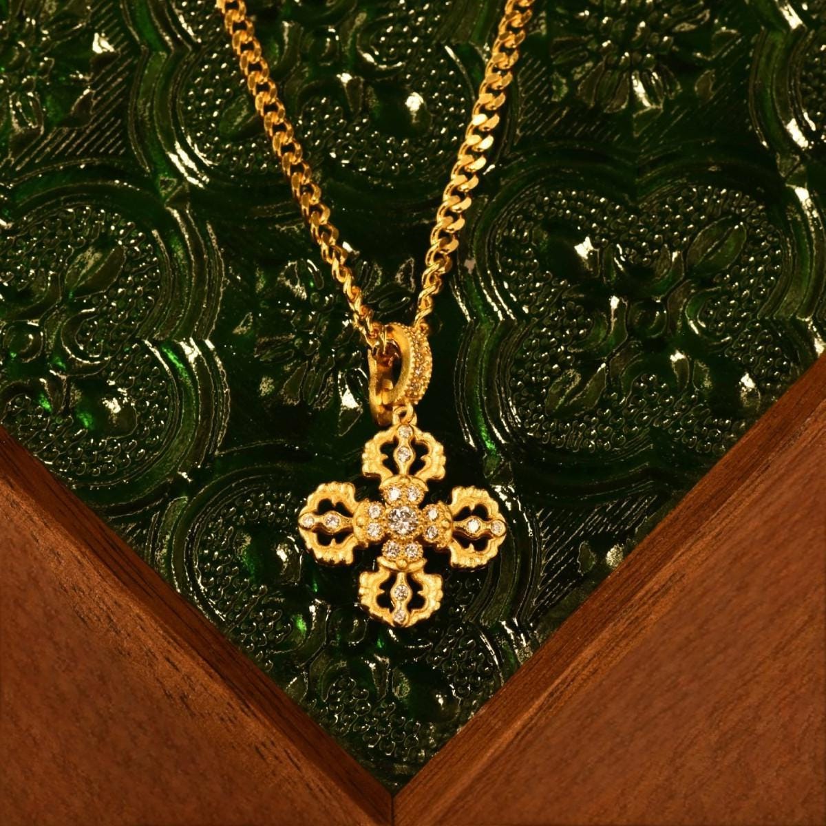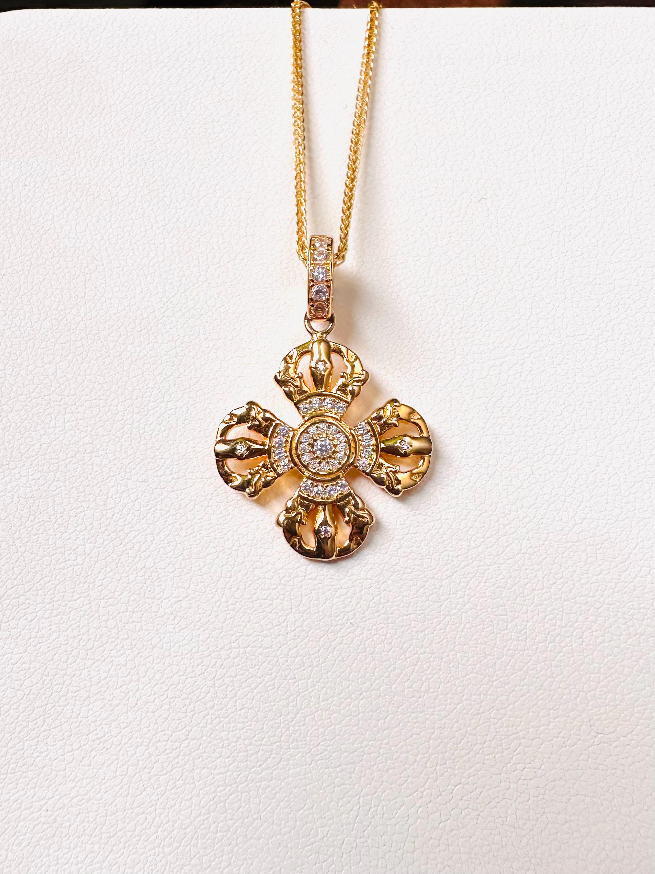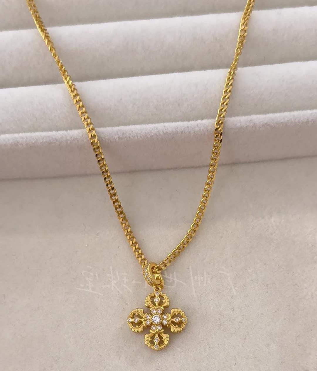 Material: S925 silver plated 18k gold, 5A cubic zirconia(The best simulated diamond currently available) Specifications:Weight: 6.3g Length: 45cm Technology: 1. High-quality electroplating 2. Set gemstones by hand Product design concept With the "Vajra" as the core design element, it integrates Tibetan Buddhist cultural symbols with modern jewelry aesthetics. The vajra symbolizes indestructible wisdom and strength, and also represents Buddhist compassion and bodhicitta, and is an important magic weapon of Buddhist Tantra. The main body is made of 925 silver, plated with 18k gold, and the edges are made of frosted and glossy dual processes, showing a sense of layering and power of metal; The brilliant light of the diamonds and the golden metal complement each other, which not only retains the solemnity and sacredness of religious ritual instruments, but also gives them fashionable wearing attributes, becoming a spiritual totem connecting faith and daily life. Product advantages 1. Exquisite craftsmanship: Precision casting process is used to ensure that the lines of each strand of the vajra are smooth and angular; The diamond is firmly set with a prong, which is stable and not easy to fall off, and the details are full of ingenuity. 2. Versatile to wear: The pendant is moderately sized, suitable for daily wear, and can be matched with all kinds of clothing, which not only highlights personal taste, but also contains auspicious meanings. Maintenance 1. Sealed preservation: When not wearing, place the silver jewelry in a closed small bag to avoid contact with air and reduce the chance of oxidation. 2. Avoid contact with chemicals: Try to avoid contact with chemicals such as perfumes, cosmetics, and dish soap 3. Regular cleaning: Use mild soapy water or special silver jewelry cleaners, and avoid using cleaners containing strong acid and alkali ingredients to avoid scratching the surface of silver jewelry 4. Avoid friction: When storing silver jewelry, avoid mixing it with other metal jewelry to avoid scratches caused by rubbing against each other. Applicable scenarios Daily outings, date moments, special commemorations, light social occasions