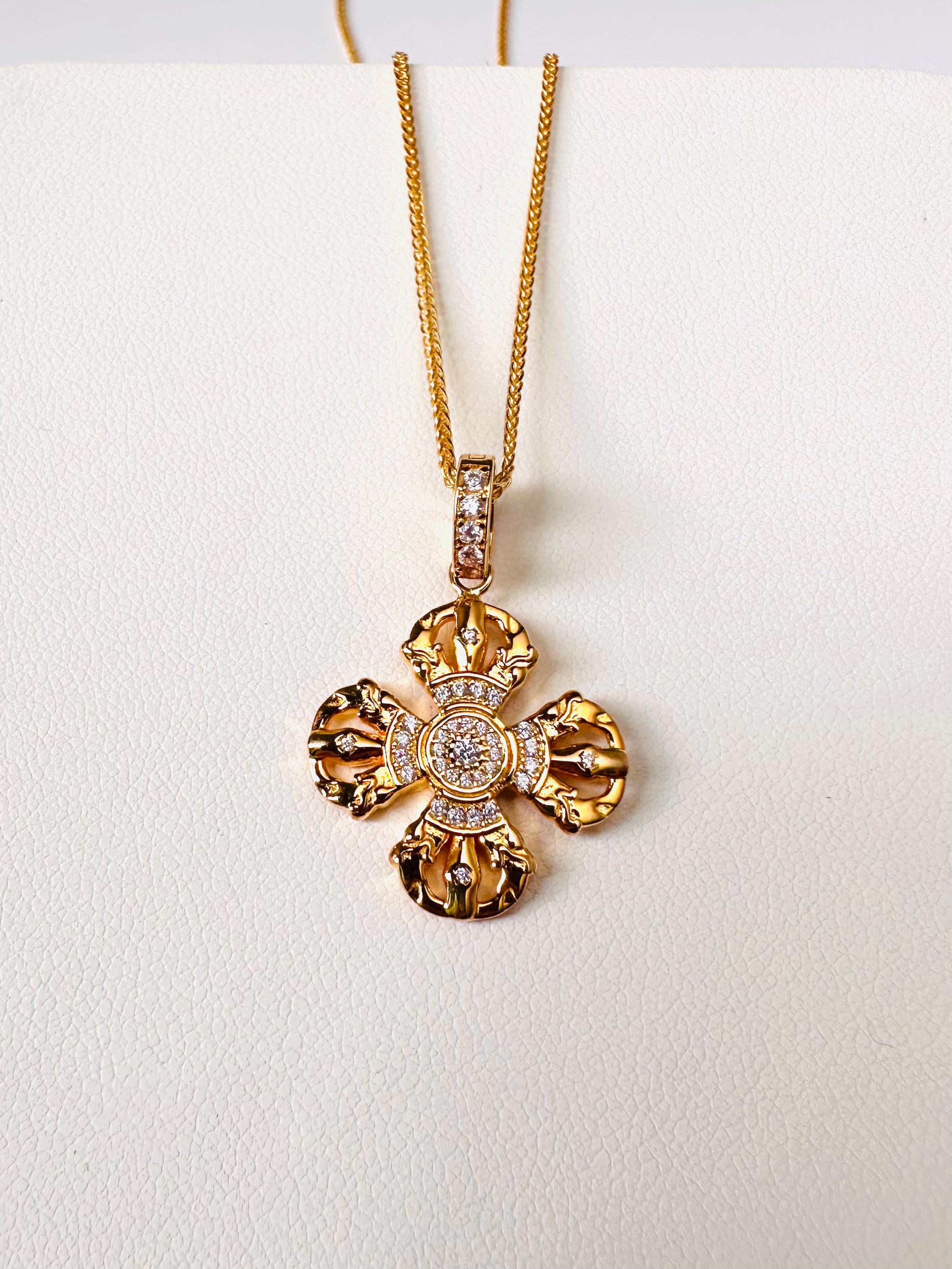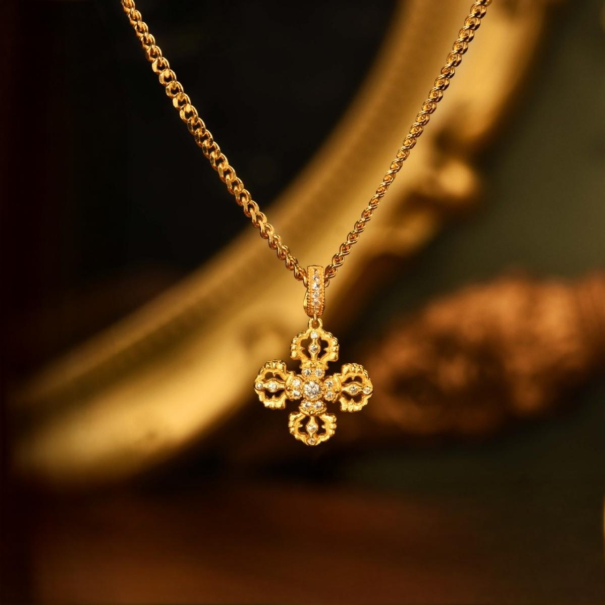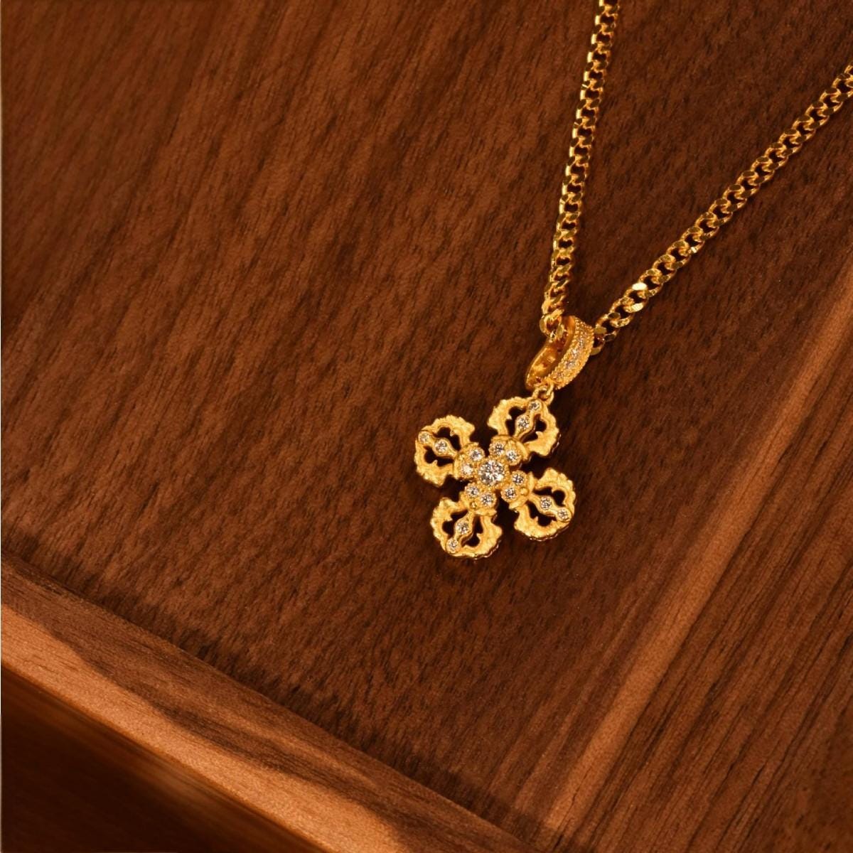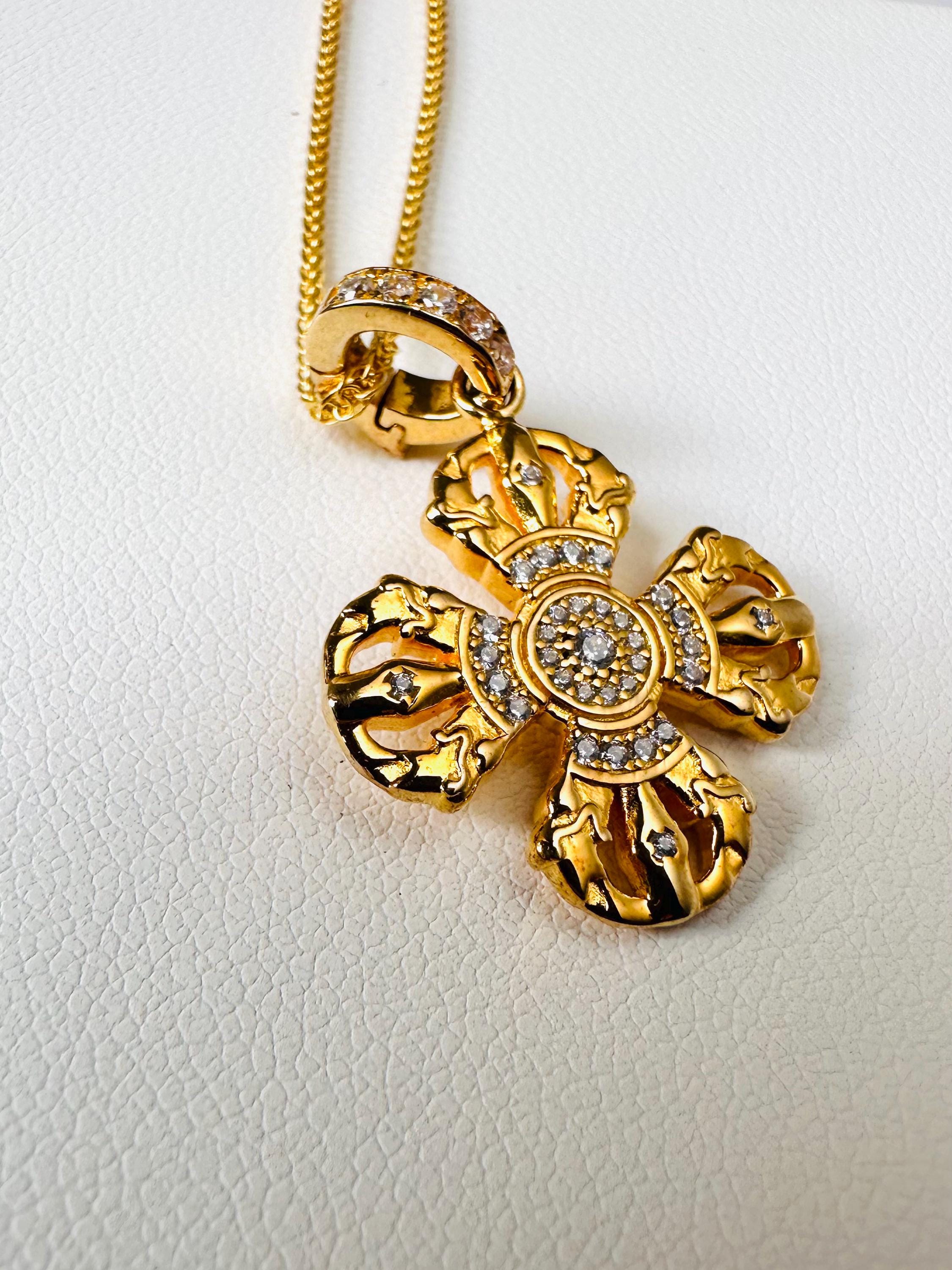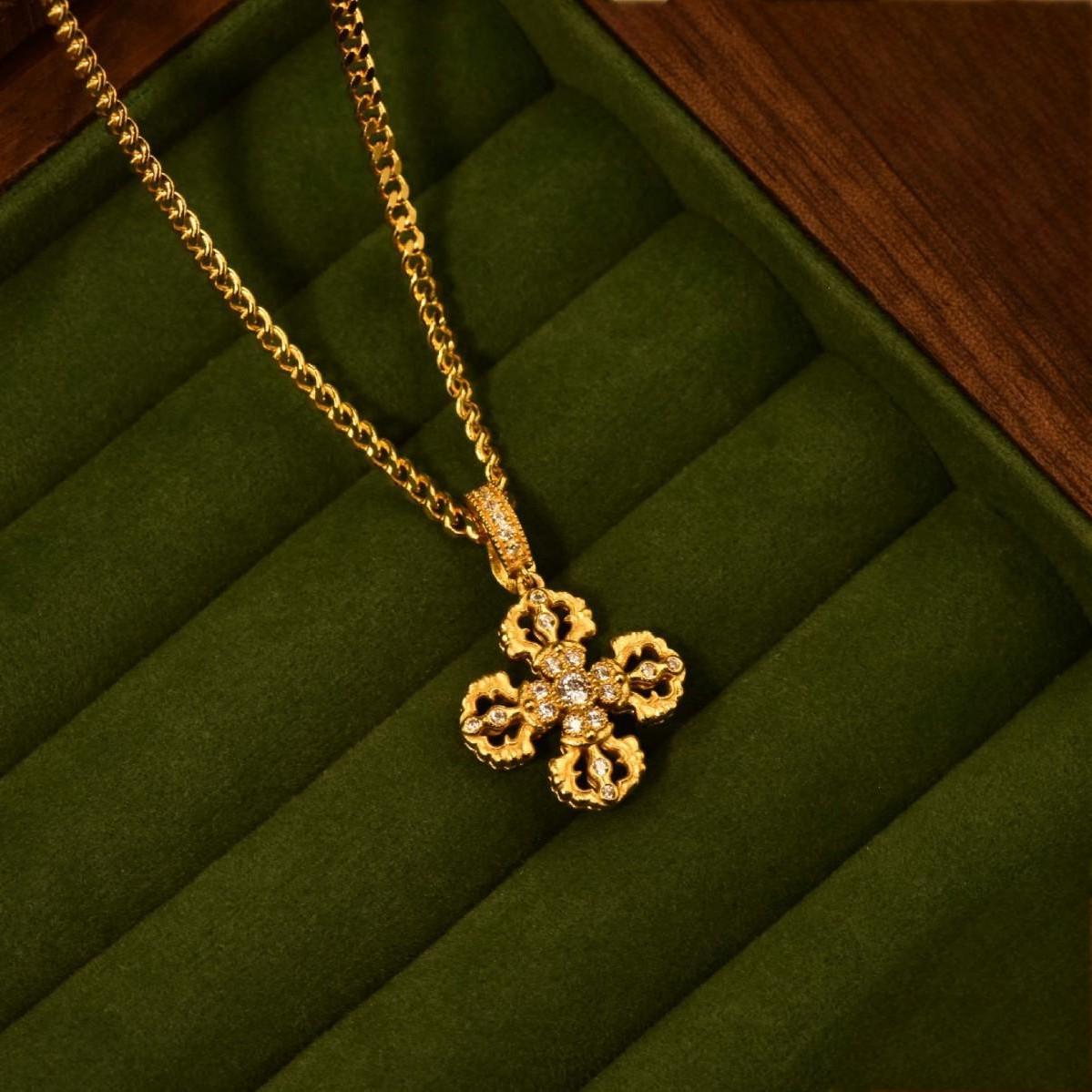 Material: S925 silver plated 18k gold, 5A cubic zirconia(The best simulated diamond currently available) Specifications:Weight: 6.3g Length: 45cm Technology: 1. High-quality electroplating 2. Set gemstones by hand Product design concept With the "Vajra" as the core design element, it integrates Tibetan Buddhist cultural symbols with modern jewelry aesthetics. The vajra symbolizes indestructible wisdom and strength, and also represents Buddhist compassion and bodhicitta, and is an important magic weapon of Buddhist Tantra. The main body is made of 925 silver, plated with 18k gold, and the edges are made of frosted and glossy dual processes, showing a sense of layering and power of metal; The brilliant light of the diamonds and the golden metal complement each other, which not only retains the solemnity and sacredness of religious ritual instruments, but also gives them fashionable wearing attributes, becoming a spiritual totem connecting faith and daily life. Product advantages 1. Exquisite craftsmanship: Precision casting process is used to ensure that the lines of each strand of the vajra are smooth and angular; The diamond is firmly set with a prong, which is stable and not easy to fall off, and the details are full of ingenuity. 2. Versatile to wear: The pendant is moderately sized, suitable for daily wear, and can be matched with all kinds of clothing, which not only highlights personal taste, but also contains auspicious meanings. Maintenance 1. Sealed preservation: When not wearing, place the silver jewelry in a closed small bag to avoid contact with air and reduce the chance of oxidation. 2. Avoid contact with chemicals: Try to avoid contact with chemicals such as perfumes, cosmetics, and dish soap 3. Regular cleaning: Use mild soapy water or special silver jewelry cleaners, and avoid using cleaners containing strong acid and alkali ingredients to avoid scratching the surface of silver jewelry 4. Avoid friction: When storing silver jewelry, avoid mixing it with other metal jewelry to avoid scratches caused by rubbing against each other. Applicable scenarios Daily outings, date moments, special commemorations, light social occasions