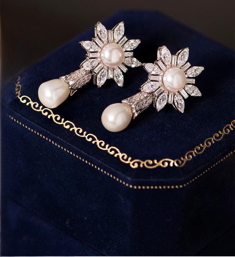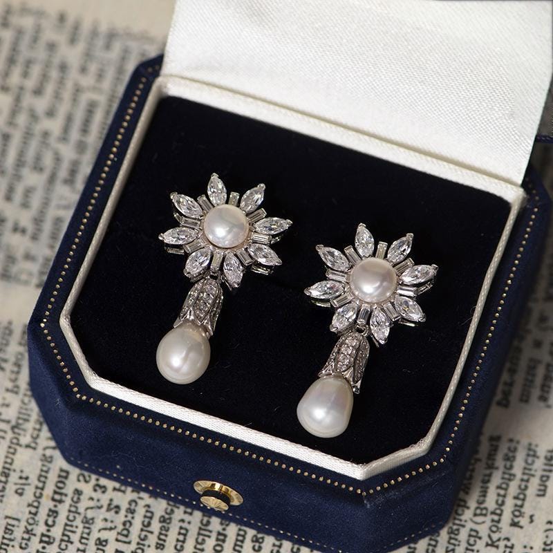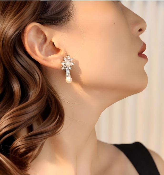 Specifications: Length: 30mm Technology: 1. High-quality electroplating 2. Set gemstones by hand Product design concept With "bright and warm symbiosis" as the core, fine diamonds are composed of starlight and pearls as the center, and both rigidity and softness are combined. The shape is simple, with both the dreamy of the starry sky and the elegance of pearls, and can be worn on both daily and important occasions. Product advantages 1. Fine craftsmanship: the diamond micro-setting is firm, the pearl claw setting is shiny, and the metal base is polished without scratching. 2. Wide adaptation: retro modern design, can be worn with suits, dresses, etc., suitable for workplace, banquets and other scenes. Maintenance 1. Sealed preservation: When not wearing, place the silver jewelry in a closed small bag to avoid contact with air and reduce the chance of oxidation. 2. Avoid contact with chemicals: Try to avoid contact with chemicals such as perfumes, cosmetics, and dish soap 3. Regular cleaning: Use mild soapy water or special silver jewelry cleaners, and avoid using cleaners containing strong acid and alkali ingredients to avoid scratching the surface of silver jewelry 4. Avoid friction: When storing silver jewelry, avoid mixing it with other metal jewelry to avoid scratches caused by rubbing against each other. Applicable scenarios Daily outings, date moments, special commemorations, light social occasions