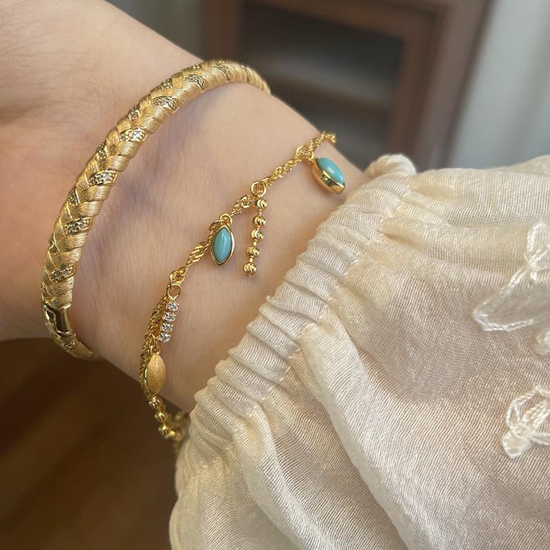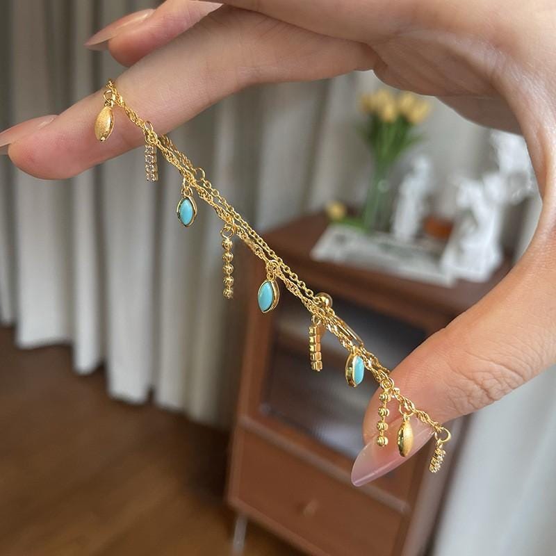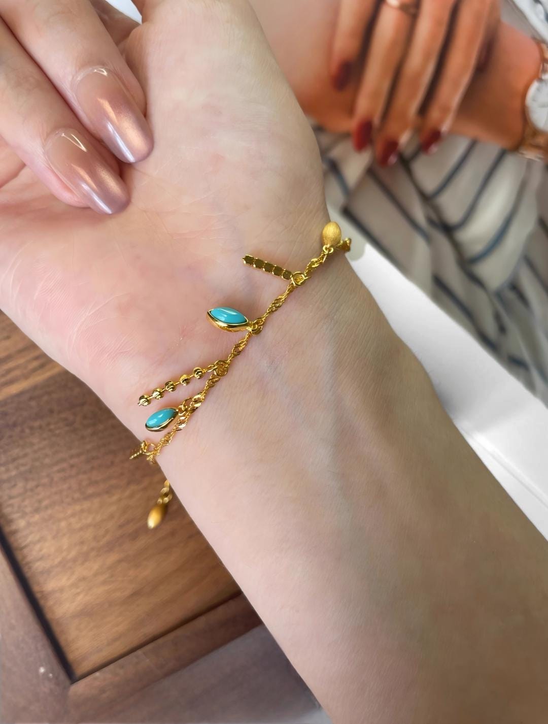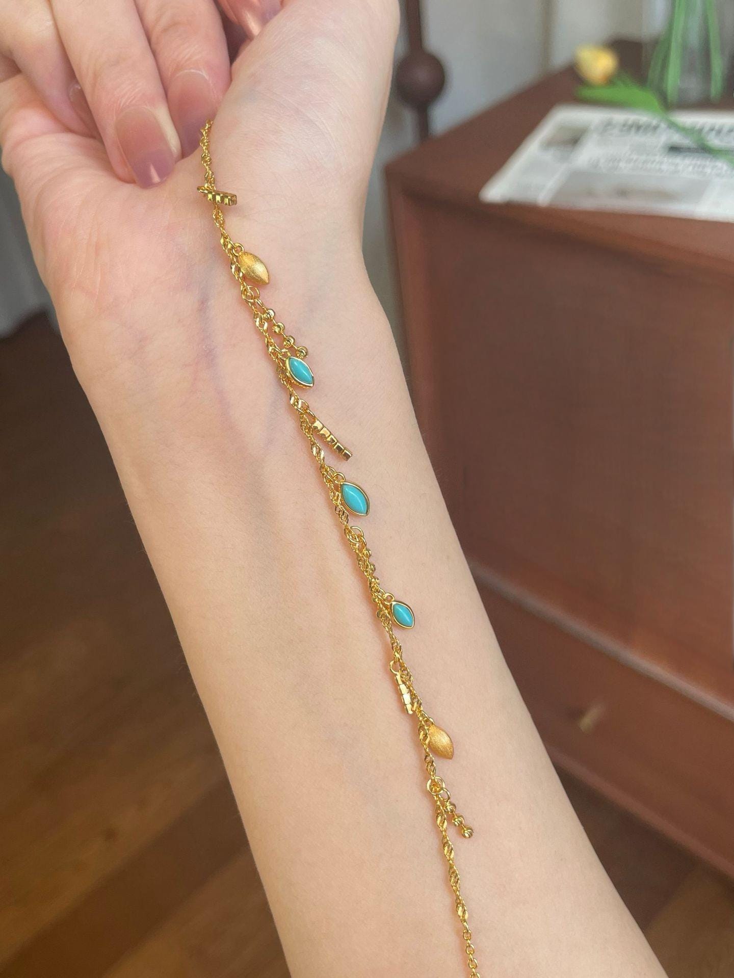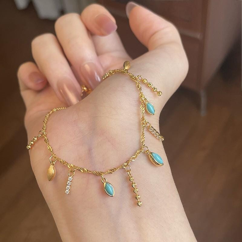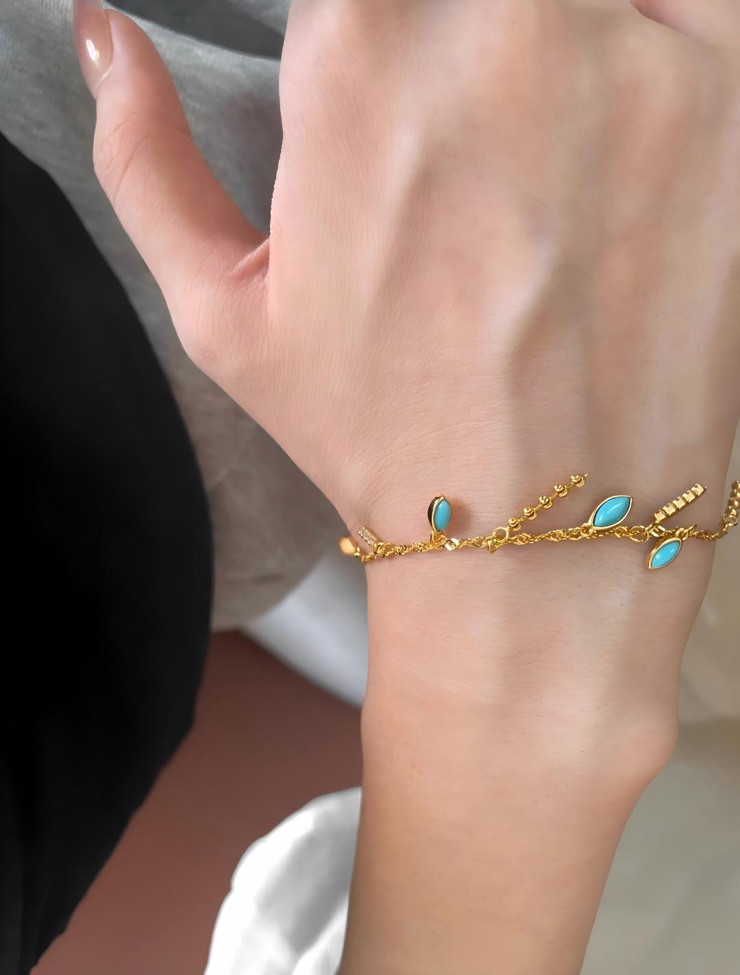 Material: S925 silver plated 18k gold,5A cubic zirconia(The best simulated diamond currently available), turquoise Specifications: chain length: 15cm + extension chain 4cm Technology: 1. High-quality electroplating 2. Set gemstones by hand Product design concept With "the beauty of nature meets light luxury fashion" as the core, it draws inspiration from natural forms such as plant leaves and water droplets, cleverly combines blue turquoise, broken diamonds and metal, and integrates the freshness and agility of nature and the sophistication of light luxury into the bracelet design, creating wrist jewelry that not only has natural charm, but also highlights the style of light luxury, so that the wearer can feel the dual charm of nature and fashion at any time. Product advantages 1. High appearance: turquoise is fresh, broken diamonds and metal shine, the shape is unique, very eye-catching, and can add color to the outfit. 2. Good texture: using high-quality materials, it looks exquisite, it has weight when worn, and it is also wear-resistant and not easy to fade. Maintenance 1. Sealed preservation: When not wearing, place the silver jewelry in a closed small bag to avoid contact with air and reduce the chance of oxidation. 2. Avoid contact with chemicals: Try to avoid contact with chemicals such as perfumes, cosmetics, and dish soap 3. Regular cleaning: Use mild soapy water or special silver jewelry cleaners, and avoid using cleaners containing strong acid and alkali ingredients to avoid scratching the surface of silver jewelry 4. Avoid friction: When storing silver jewelry, avoid mixing it with other metal jewelry to avoid scratches caused by rubbing against each other. Applicable scenarios Daily outings, date moments, special commemorations, light social occasions
