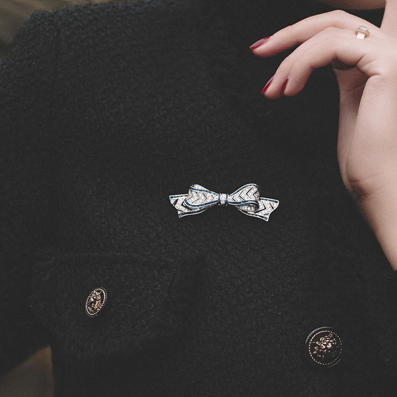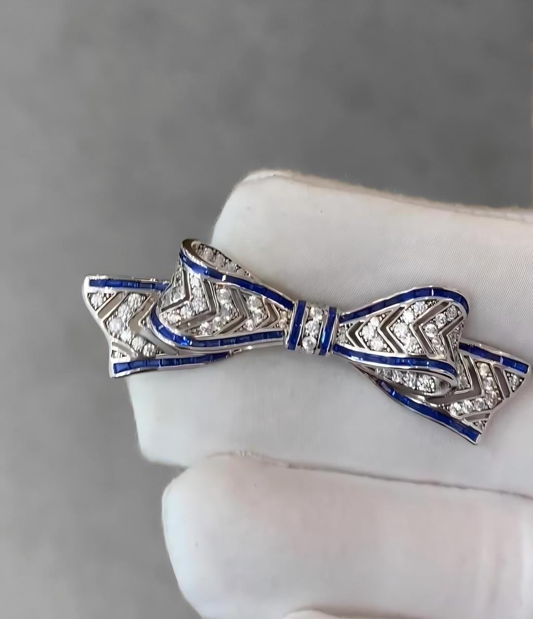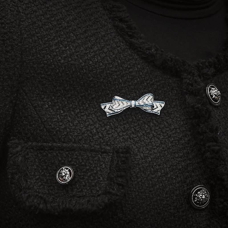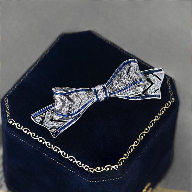 Product advantages 1. Exquisite and eye-catching: The bow shape is classic and feminine, with diamonds and blue spinel the visual effect is gorgeous and bright, which can instantly enhance the sophistication and luxury of the clothing. 2. Excellent craftsmanship quality: the gemstone is firmly inlaid, the metal part is finely polished, and the craftsmanship is exquisite, which not only has a beautiful appearance, but also is durable, and can maintain a good wearing effect for a long time.