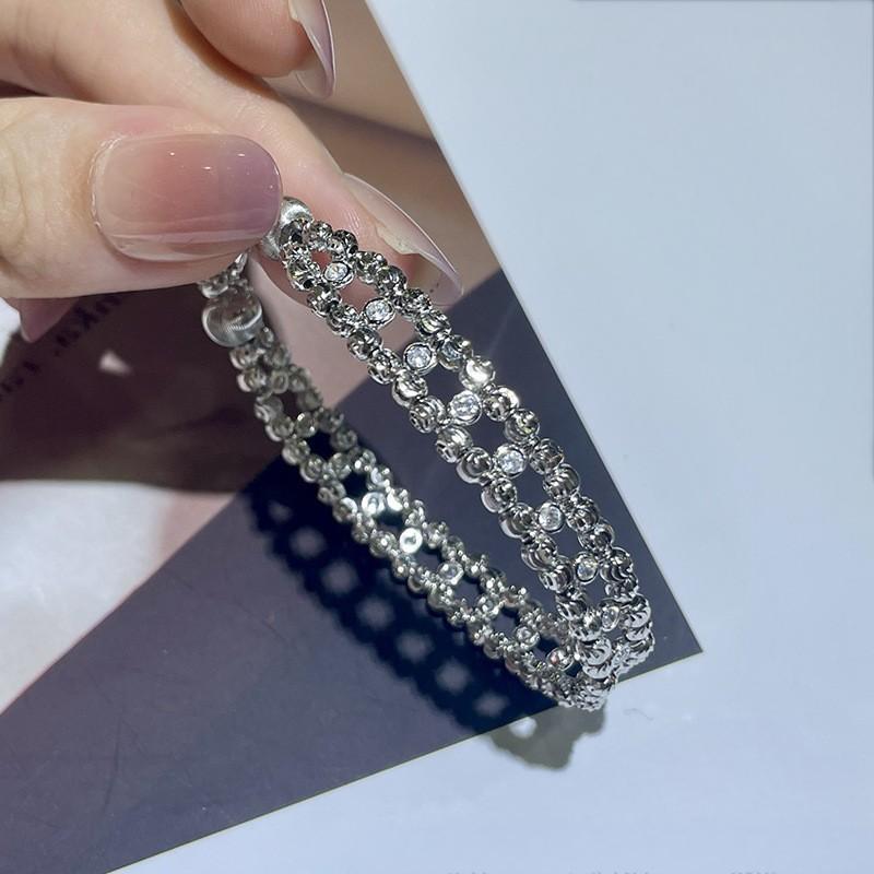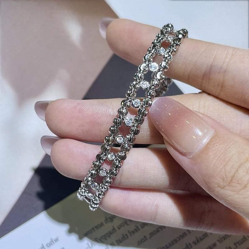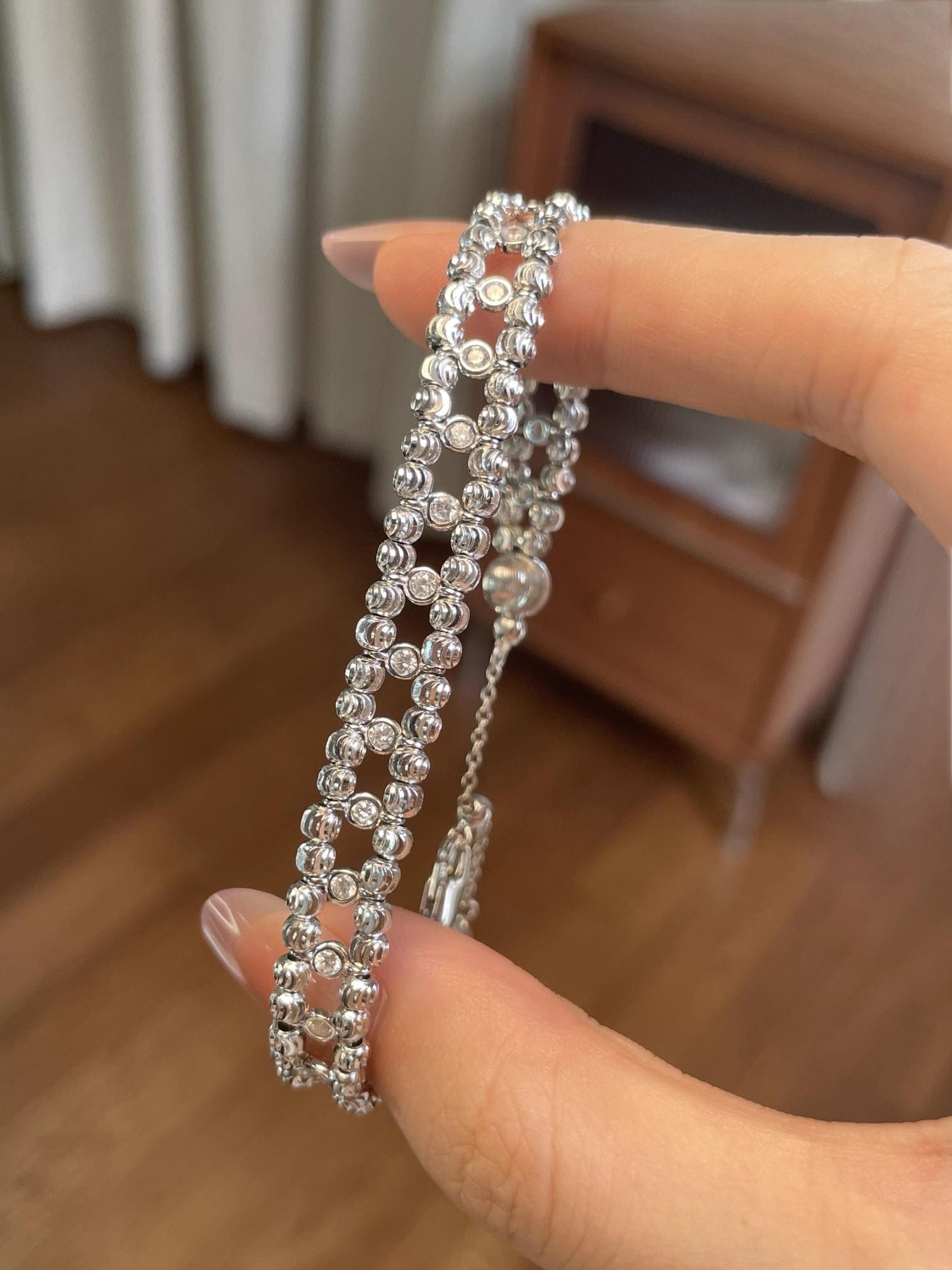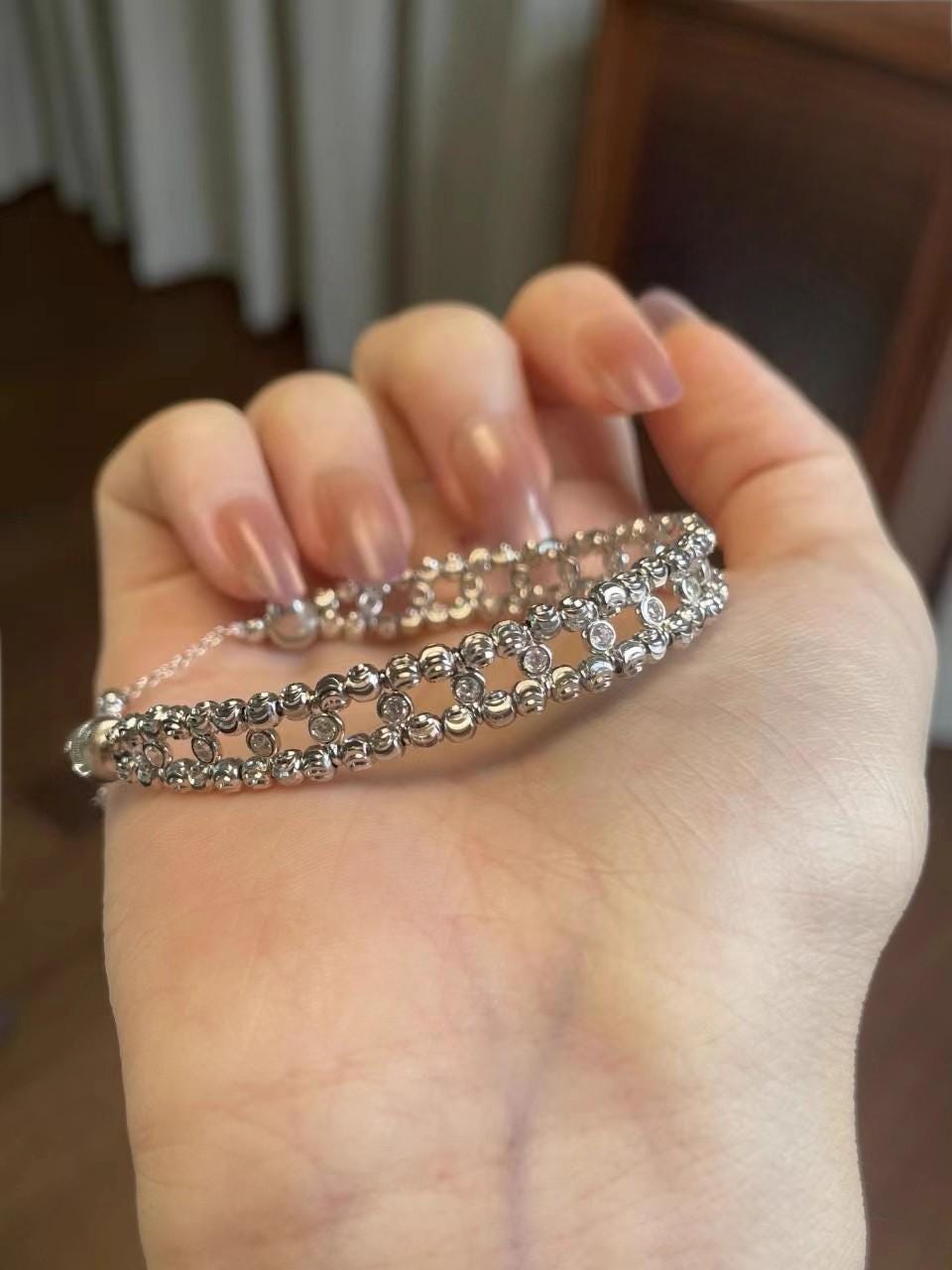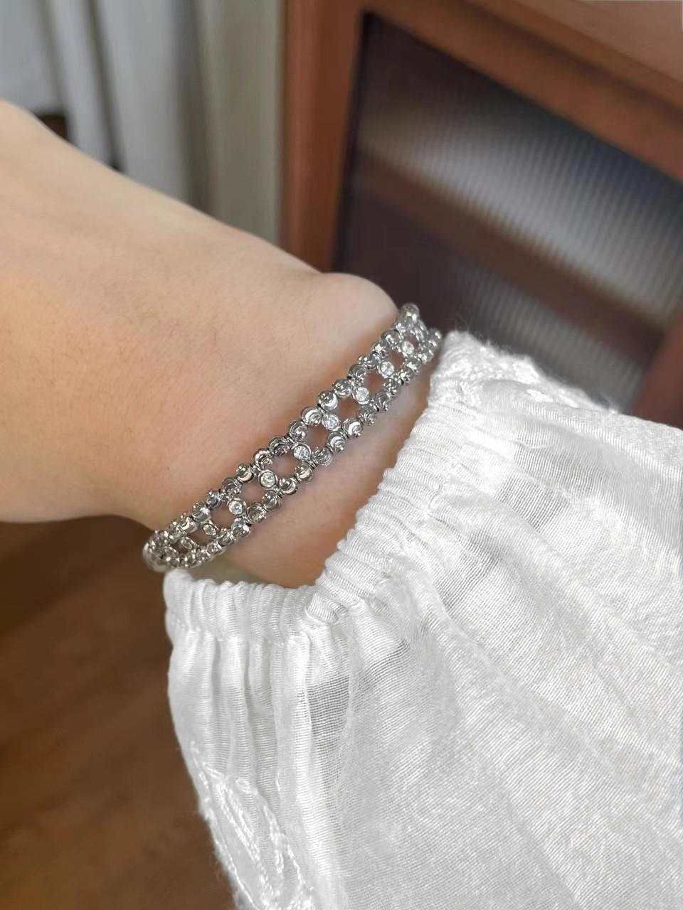 Technology: 1. High-quality electroplating 2. Set gemstones by hand Product design concept This bracelet is designed with the concept of "Galaxy Wrist Wrap, Exquisite Daily Life", and regards the dense sparkling diamond elements as stars in the night sky, and condenses the brilliance and agility of the galaxy on the wrist through delicate metal weaving technology. It aims to create an accessory that can add brilliance to the look at any time and convey a refined and sparkling temperament, making every hand raised feel like a galaxy flowing on the wrist. Product advantages 1. Shine and catch the eye: The sparkling diamonds can refract a rich and brilliant luster in the light, like a galaxy on the wrist, which can easily become a highlight in the outfit and add a sense of gorgeousness to the overall look. 2. Versatile and practical: The style is simple yet exquisite and shiny, which can be matched with daily casual wear and add exquisite details to the outfit; It can also be paired with formal clothing such as small dresses, adapting to a variety of occasions and styles. Maintenance 1. Sealed preservation: When not wearing, place the silver jewelry in a closed small bag to avoid contact with air and reduce the chance of oxidation. 2. Avoid contact with chemicals: Try to avoid contact with chemicals such as perfumes, cosmetics, and dish soap 3. Regular cleaning: Use mild soapy water or special silver jewelry cleaners, and avoid using cleaners containing strong acid and alkali ingredients to avoid scratching the surface of silver jewelry 4. Avoid friction: When storing silver jewelry, avoid mixing it with other metal jewelry to avoid scratches caused by rubbing against each other. Applicable scenarios Daily outings, date moments, special commemorations, light social occasions
