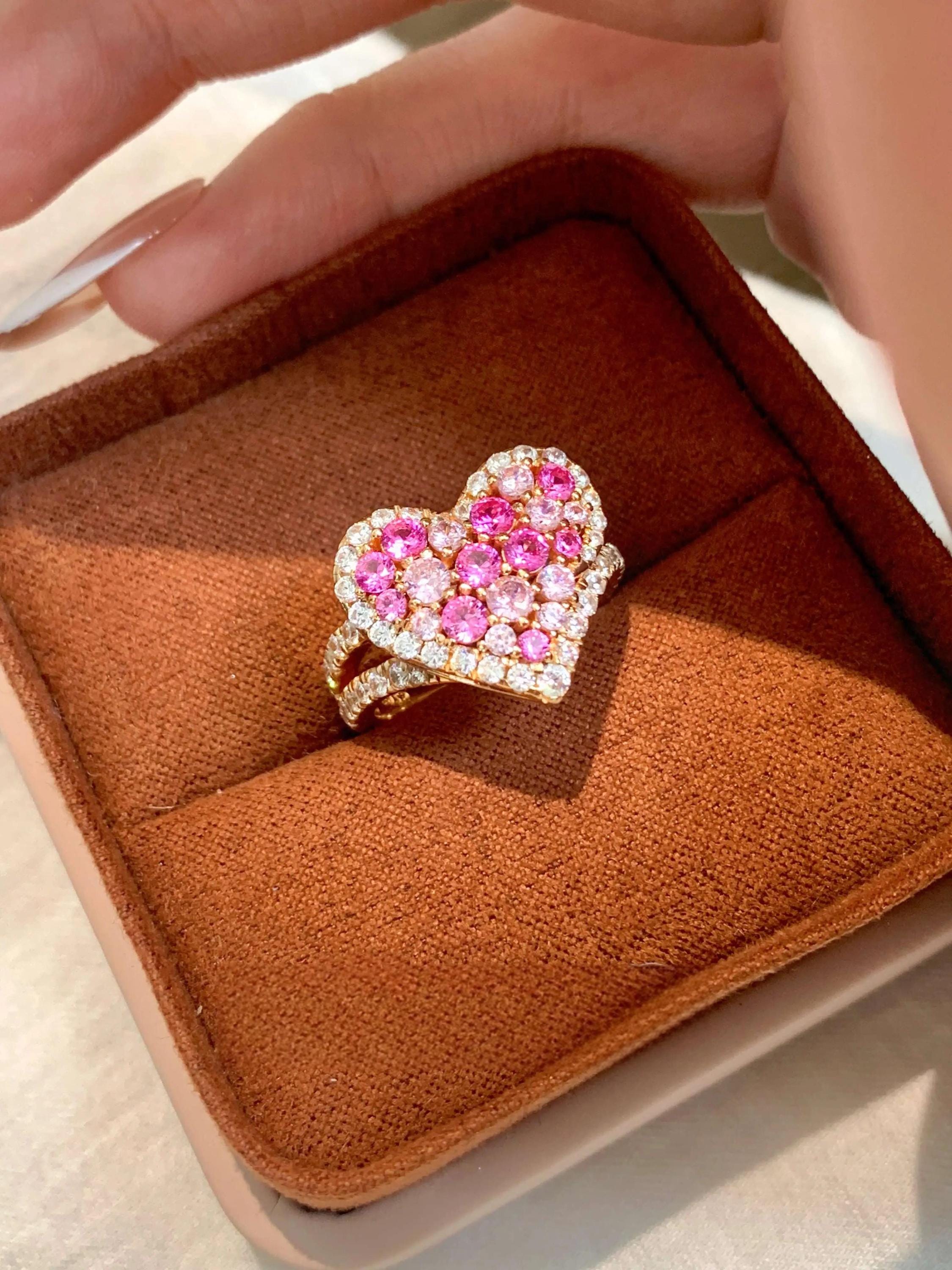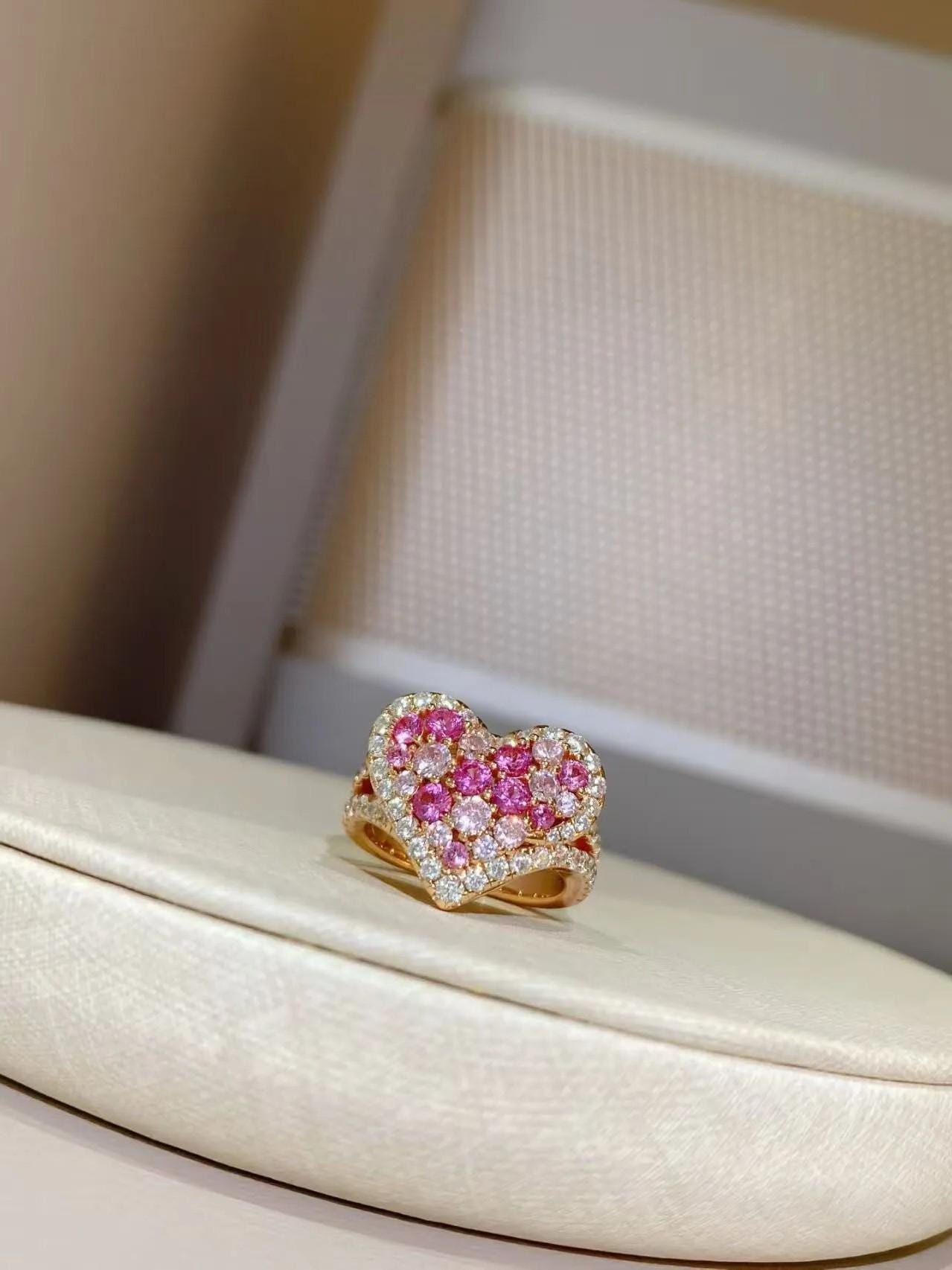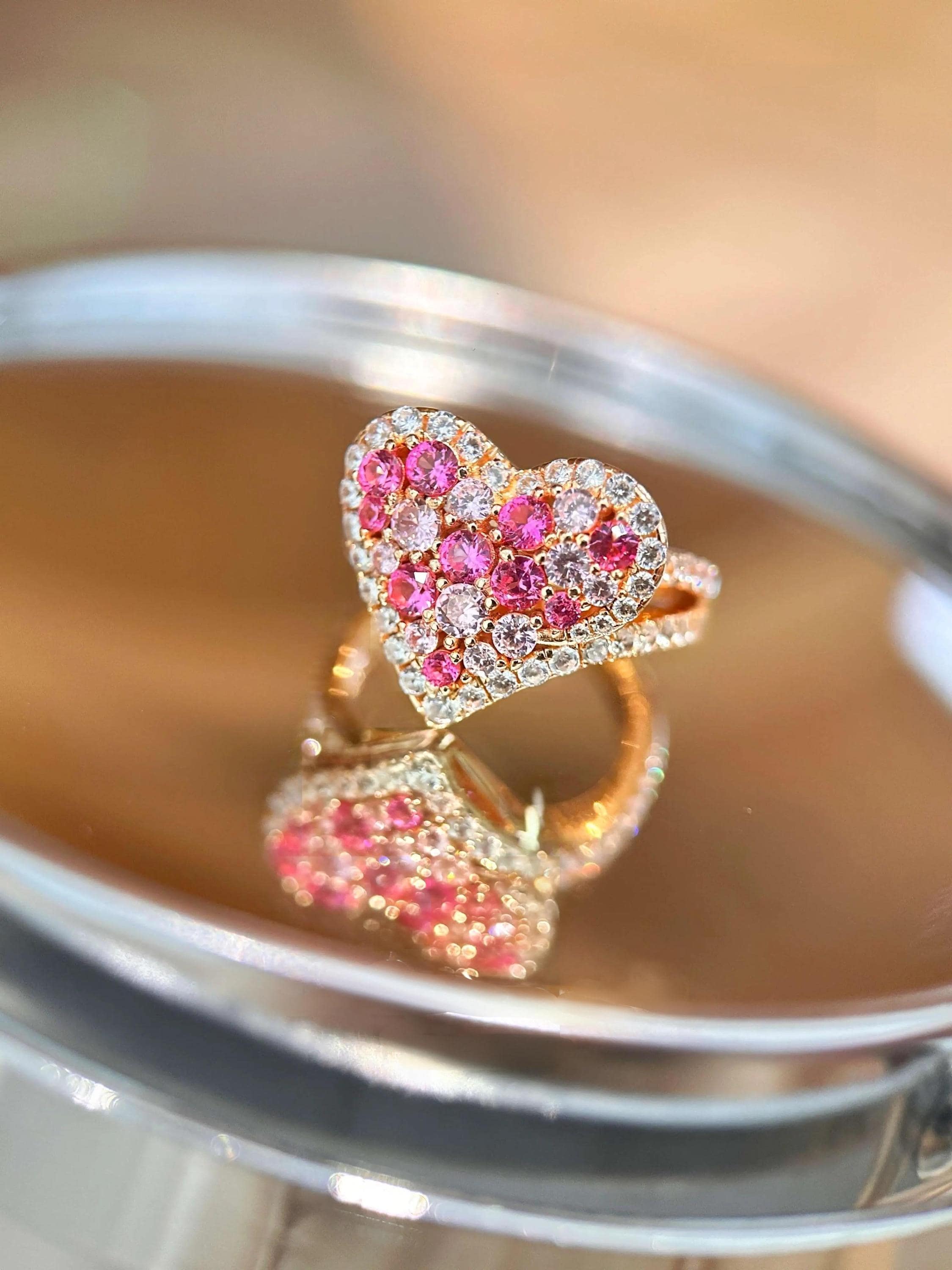 3. Product Advantages: - Premium Material: 925 sterling silver base ensures comfort and hypoallergenic wear; - Exquisite Craftsmanship: Hand-set 5A cubic zirconia for high sparkle, comparable to natural diamonds; - Long-Lasting Color: 10x thick plating prevents fading and extends product lifespan; - Unique Design: Heart shape with pink diamond accents, versatile for both sweet and sophisticated styles; - Comfortable Fit: Moderate width and thickness for lightweight, all-day wear. 4. Product Care: - Avoid contact with water, cosmetics, perfume, or chemicals to prevent oxidation; - Store in a sealed jewelry box or soft cloth when not in use to avoid scratches; - Clean gently with a soft cloth; do not use hard brushes or harsh cleaners; - Remove during exercise or sweating to keep the ring dry.