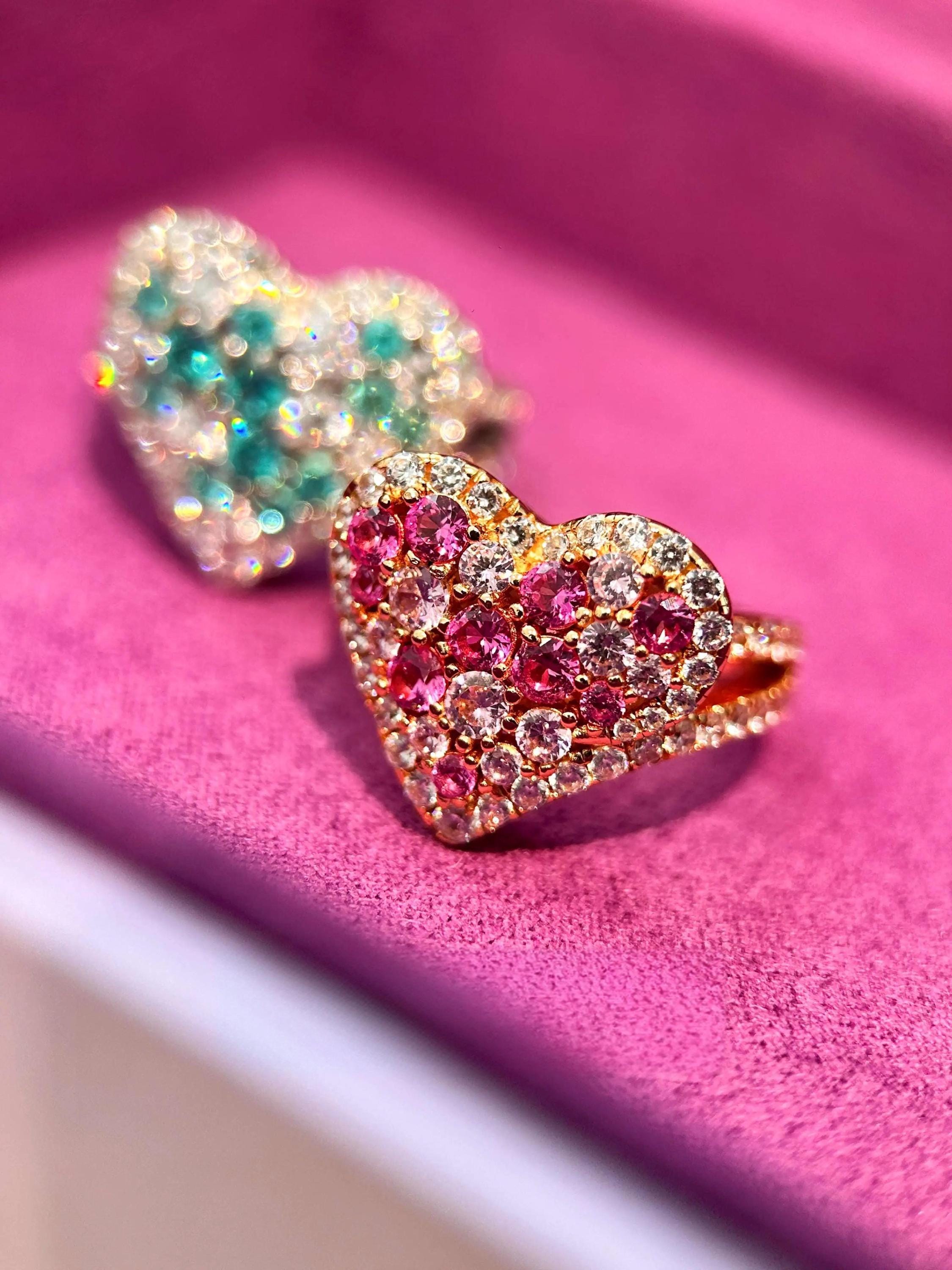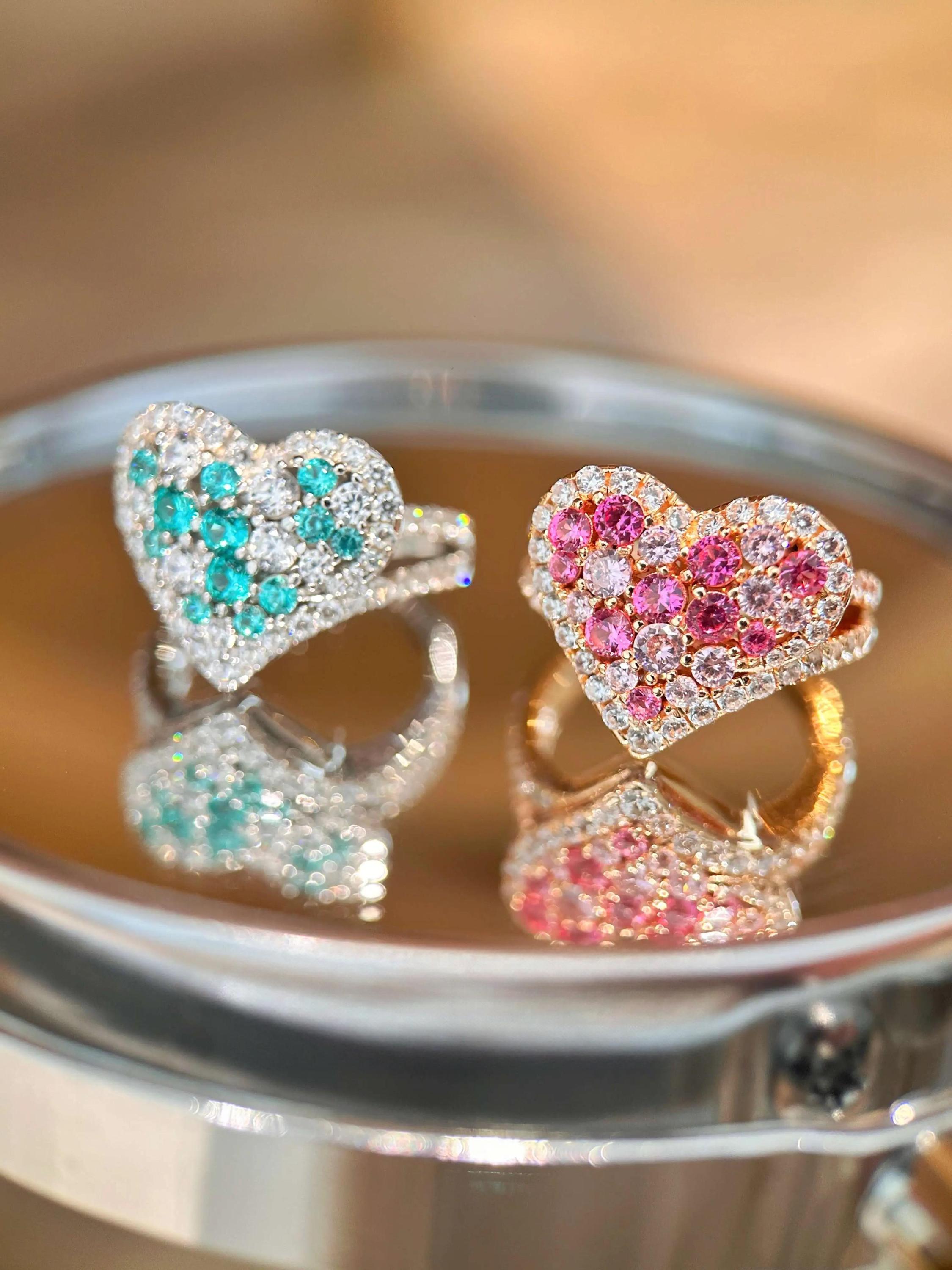 Inspired by the heart shape, this ring combines the softness of pink diamonds with sparkling brilliance. Crafted from 925 sterling silver, it features hand-set 5A cubic zirconia that mimics the fire of natural diamonds, creating a luxurious jewelry-like appearance. The "buling buling" shine adds a touch of elegance, making it perfect for both daily wear and elevating any outfit. 1. Application Scenarios: - Daily Wear: Pair with sweaters, hoodies, or shirts to add a touch to autumn/winter looks; - Dates & Dinners: A yet sparkling accessory to showcase a gentle temperament; - Holiday Gifts: Ideal for birthdays, anniversaries, or special occasions to express love and blessings; - Office & Work: Simple design with understated elegance, complementing professional attire. 2. Specification Parameters: - Material: 925 Sterling Silver - Inlay: 5A Cubic Zirconia - Plating: Color 0.5 Micron + Swimming Plating (10x thicker than standard plating, anti-fading & hypoallergenic) - Width: 2.9mm - Thickness: 2.0mm - Weight: 6.1g - Gemstone Colors: Sakura Pink / Paraiba Green (Optional)