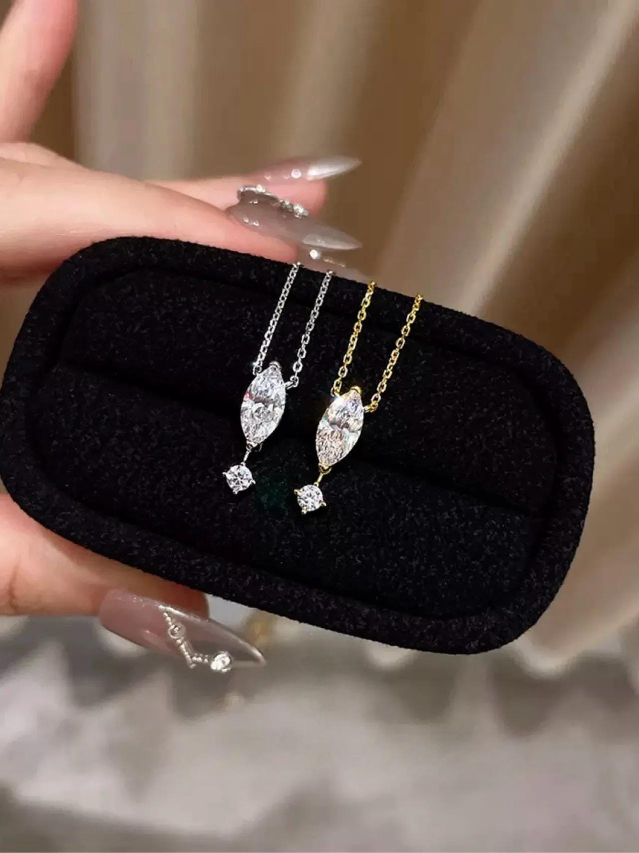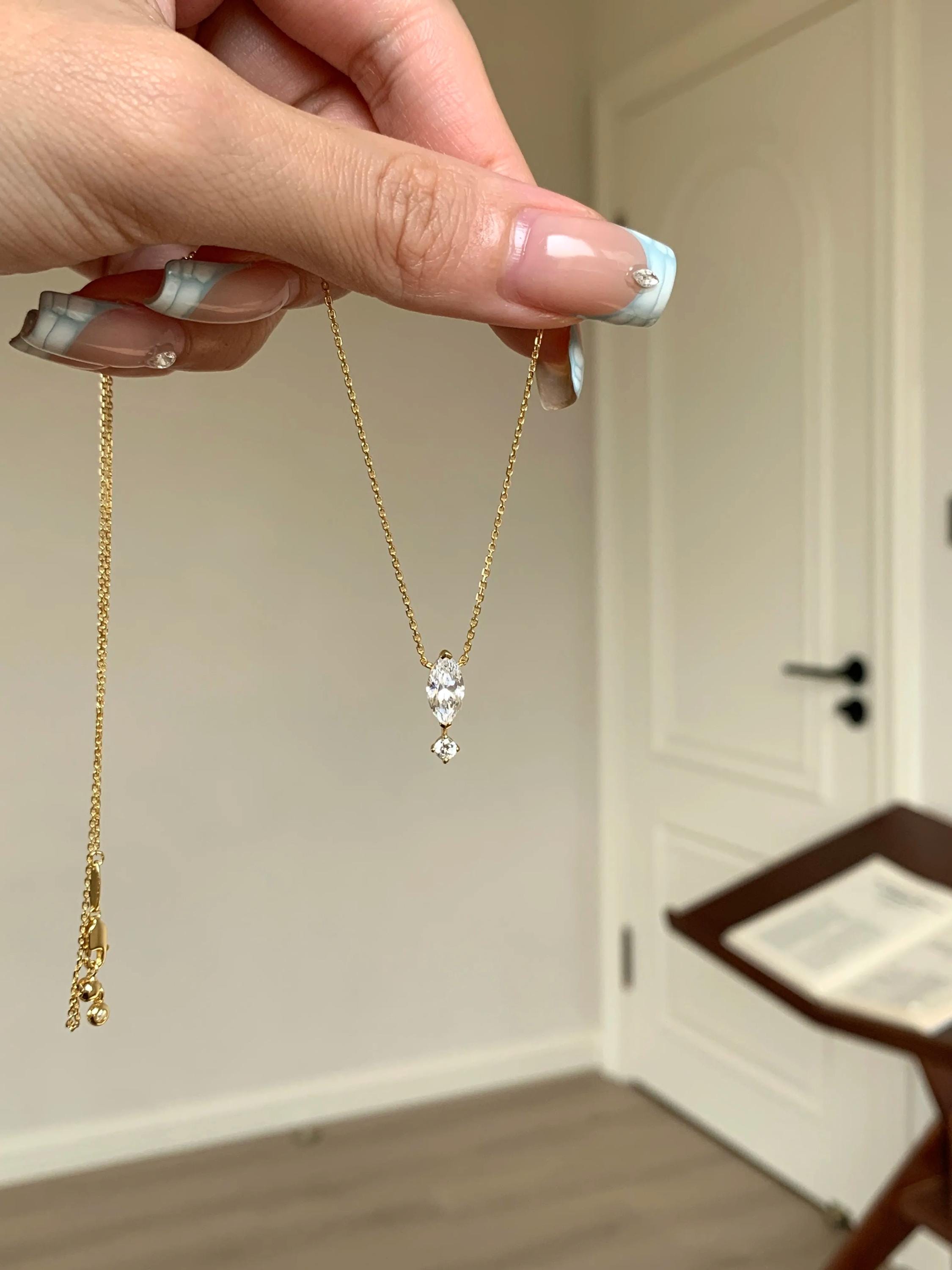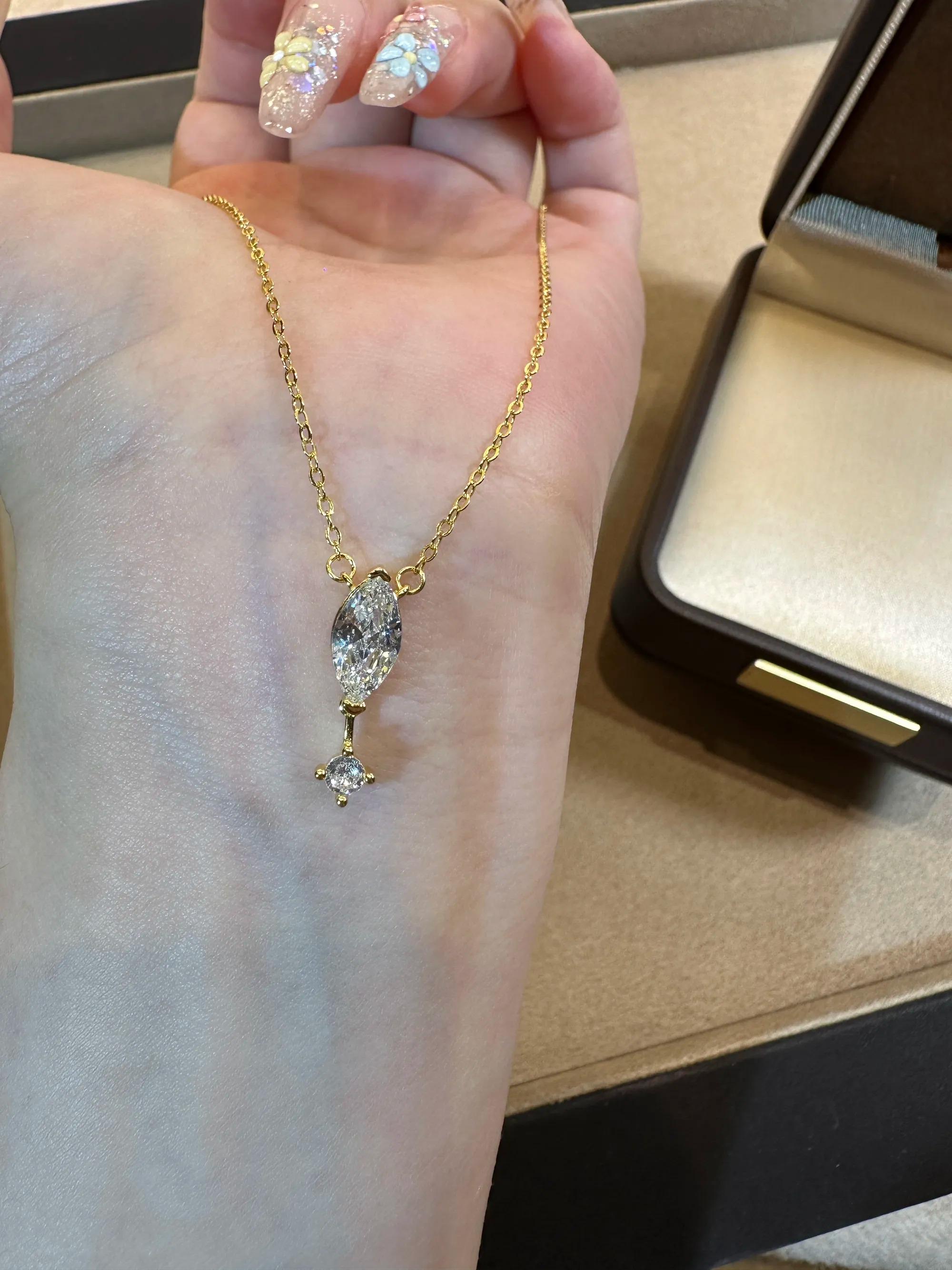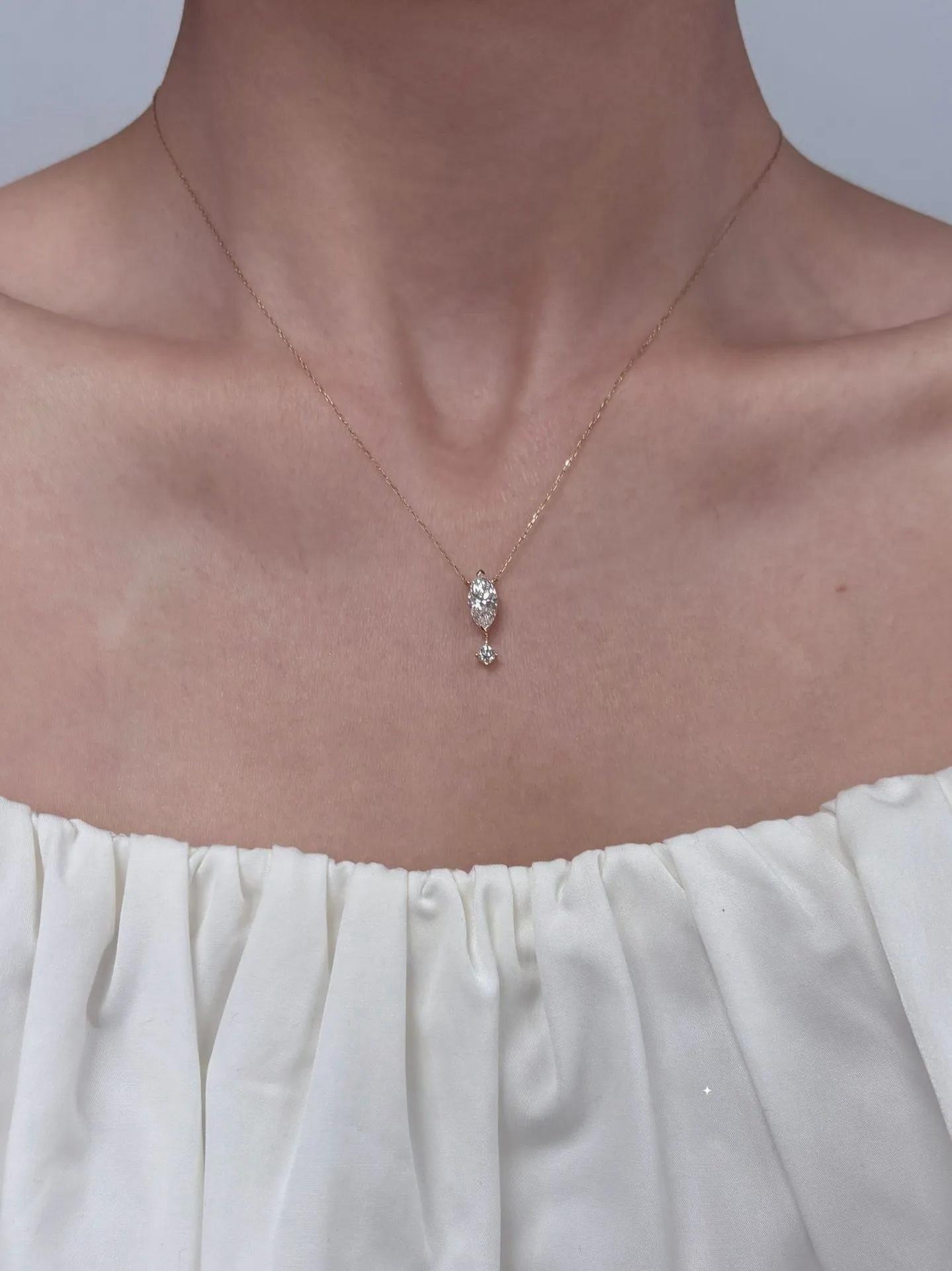 1. Design Concept Inspired by the poetic "suspended teardrop," the necklace features a 5*10mm marquise-cut main stone (1.25ct visual effect) paired with a tiny round diamond underneath, mimicking a tear frozen in mid-air. Minimalist lines blend modern aesthetics, turning every wear into a silent expression of emotion.