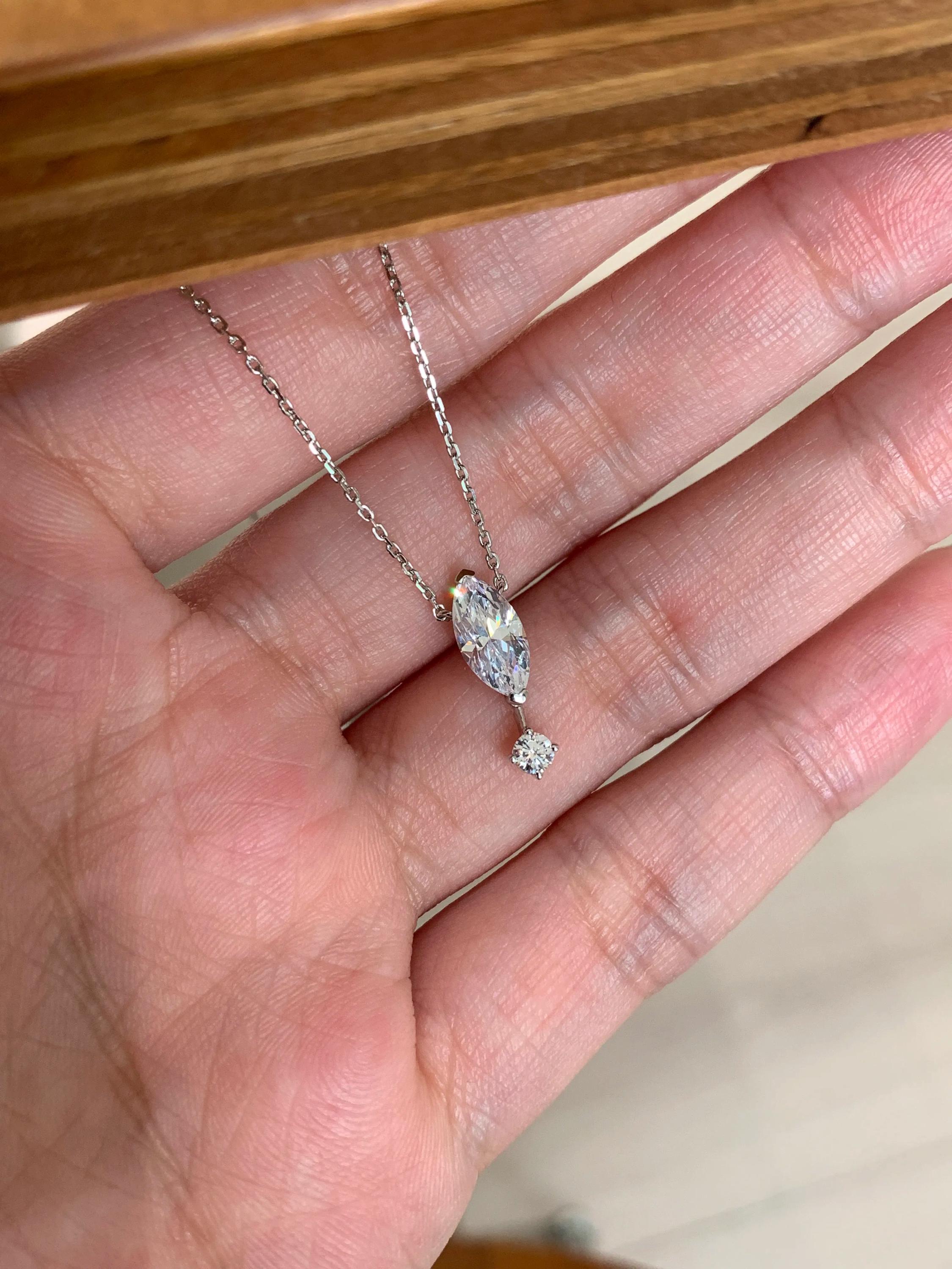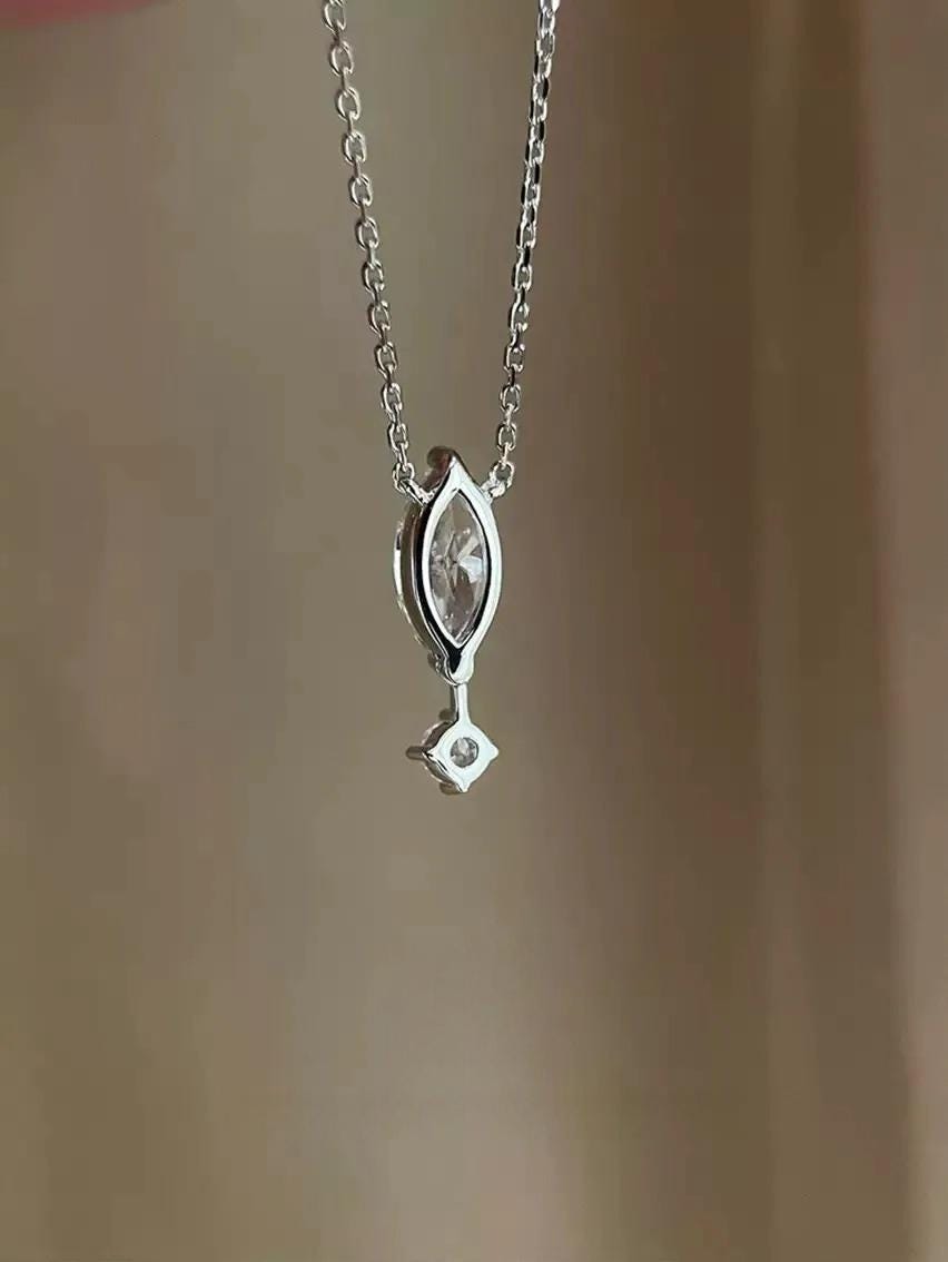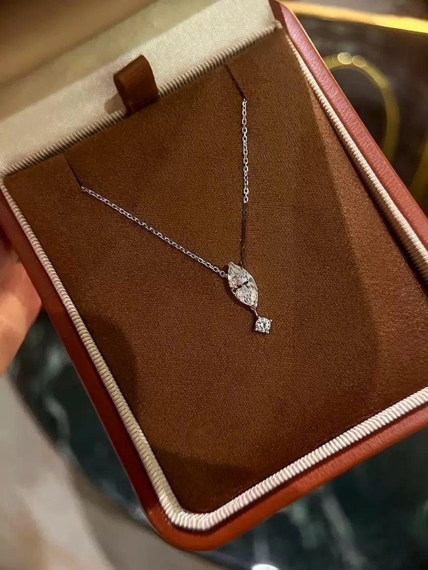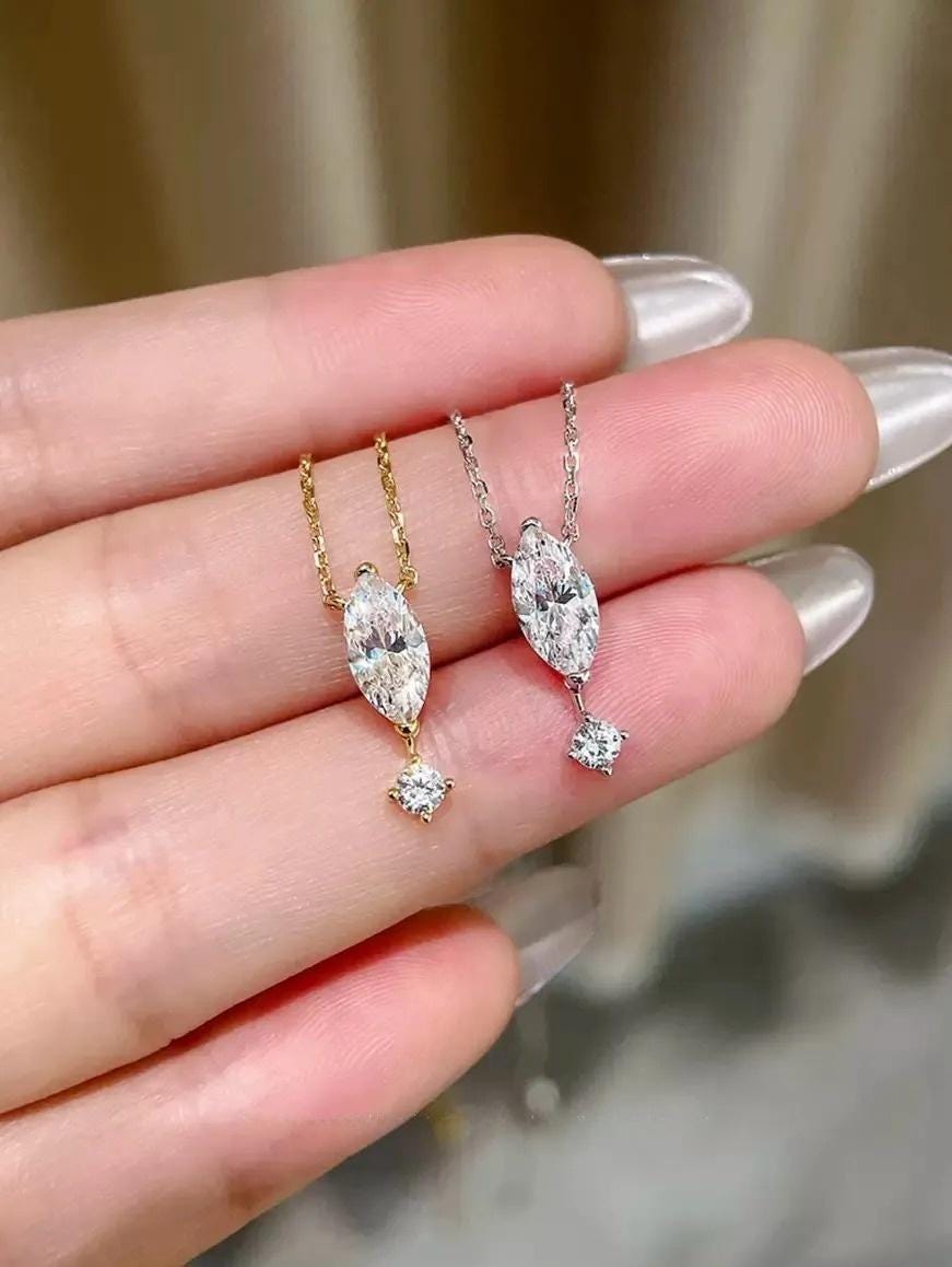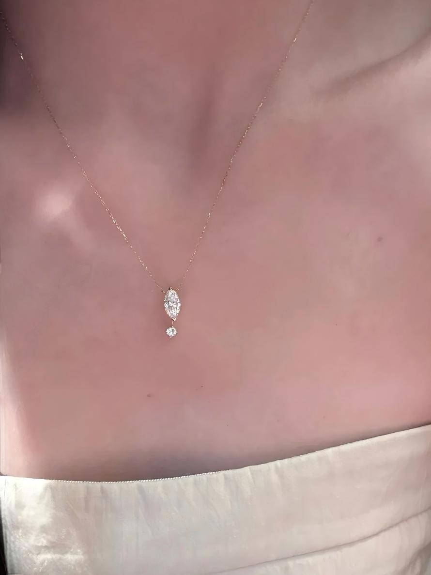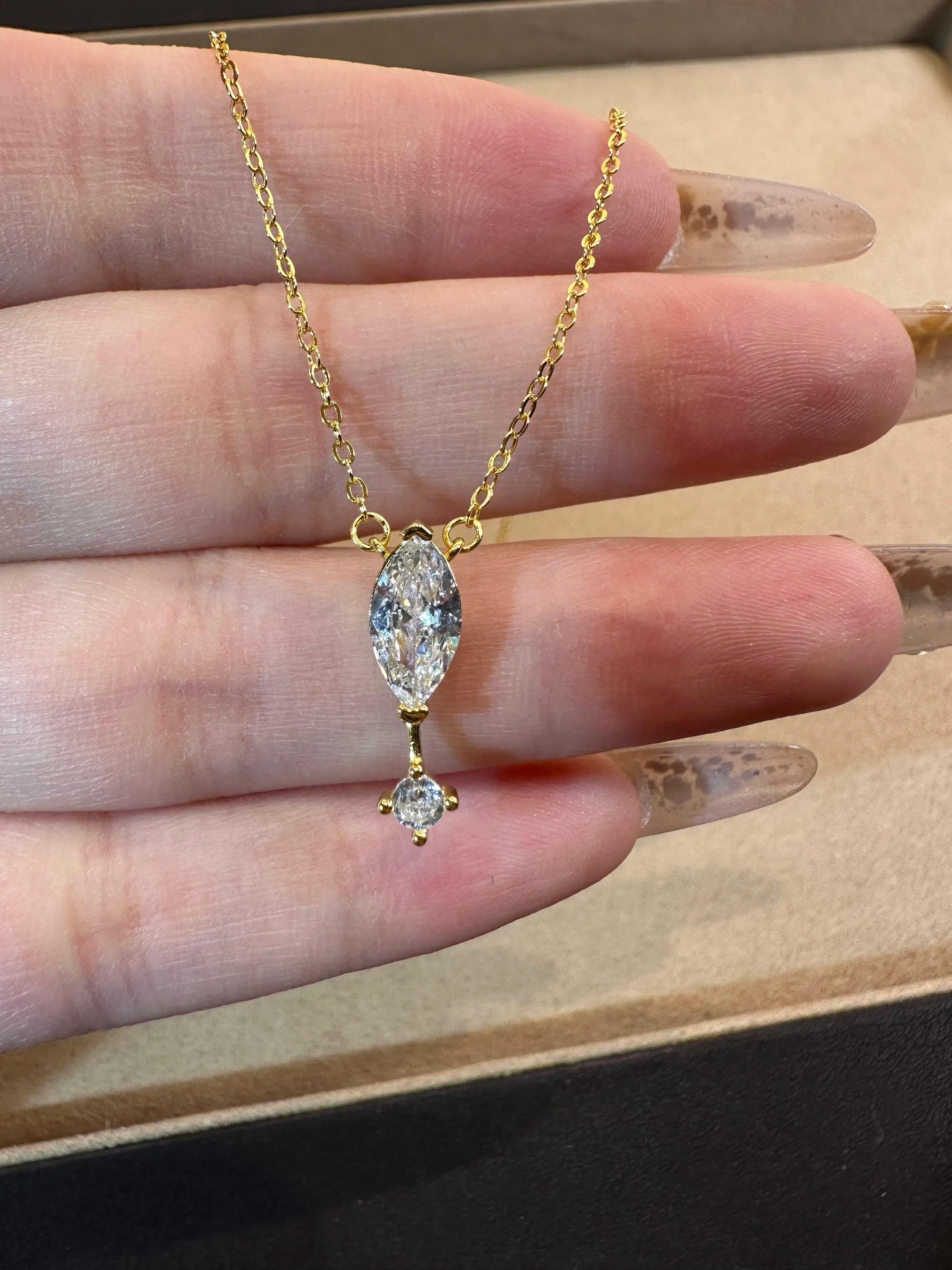 1. Design Concept Inspired by the poetic "suspended teardrop," the necklace features a 5*10mm marquise-cut main stone (1.25ct visual effect) paired with a tiny round diamond underneath, mimicking a tear frozen in mid-air. Minimalist lines blend modern aesthetics, turning every wear into a silent expression of emotion.