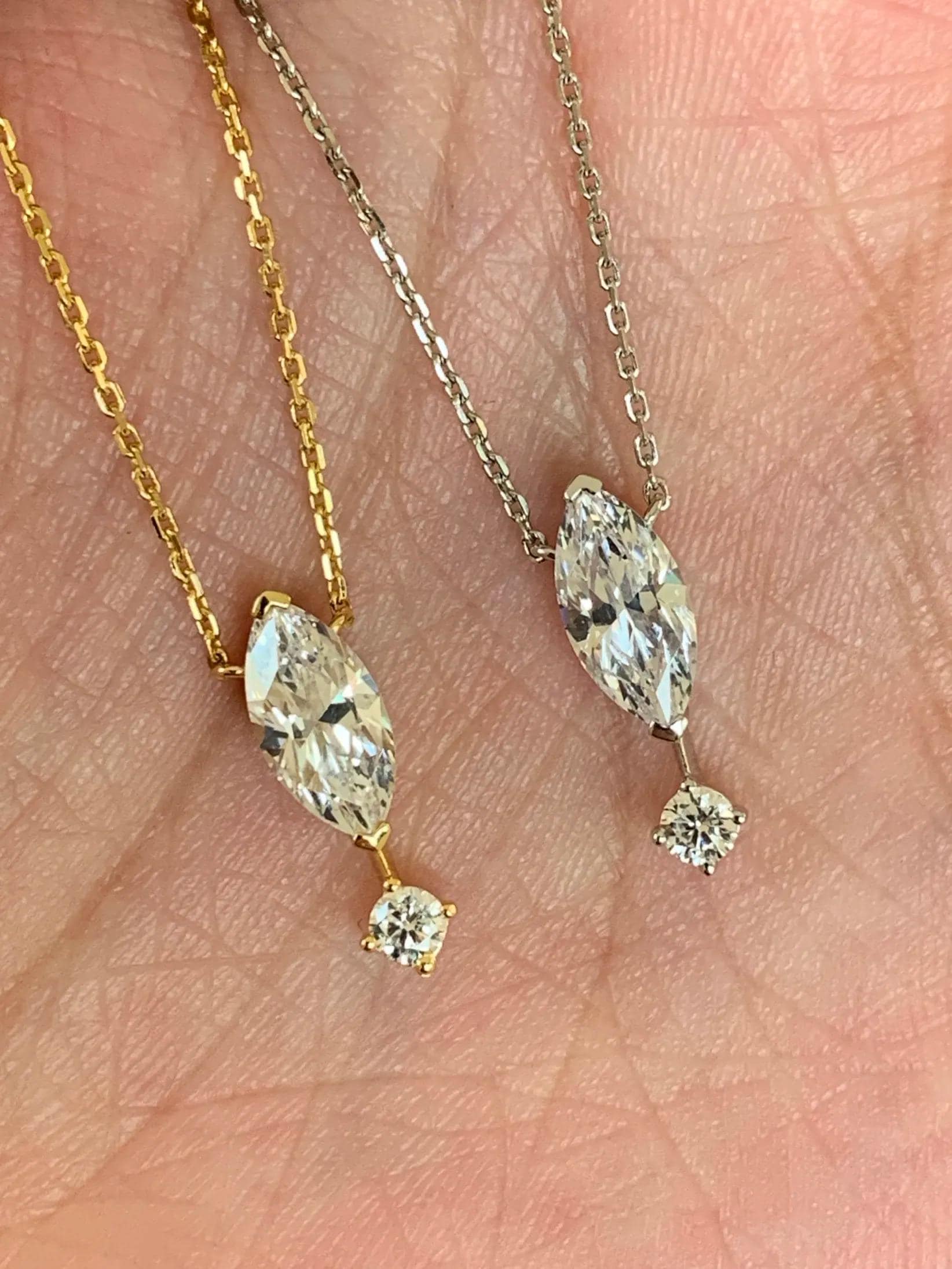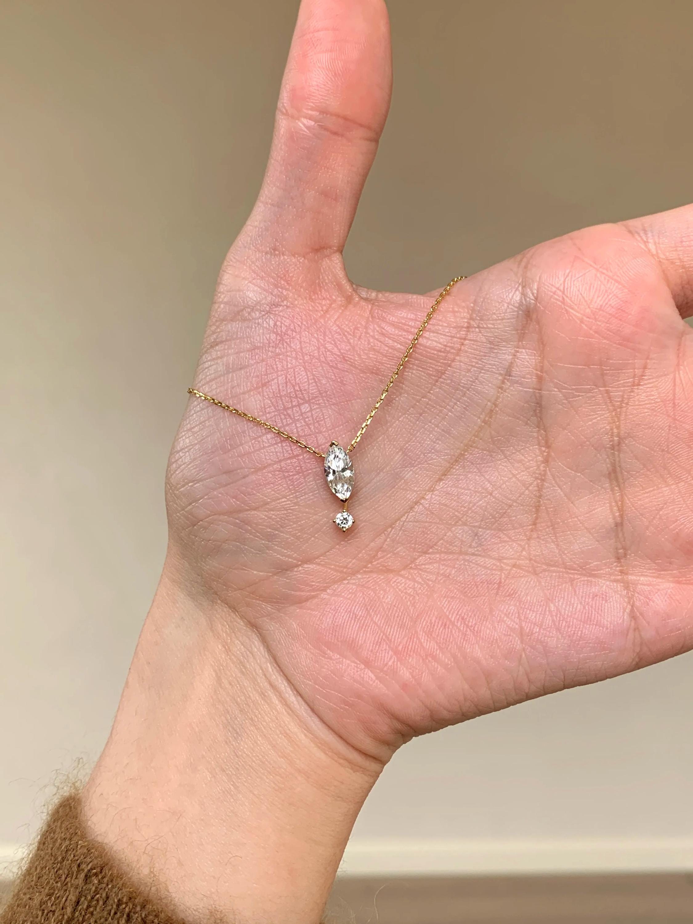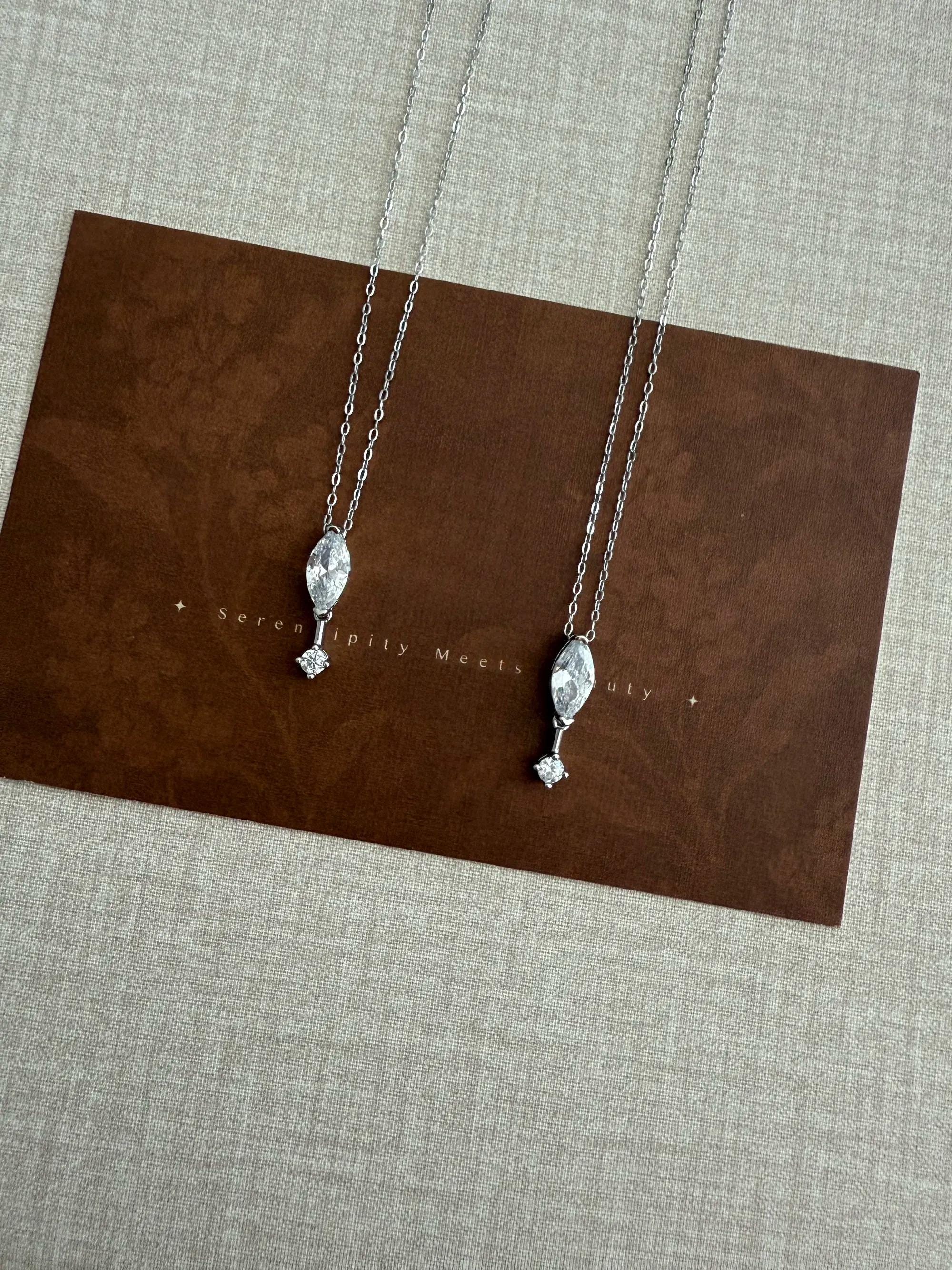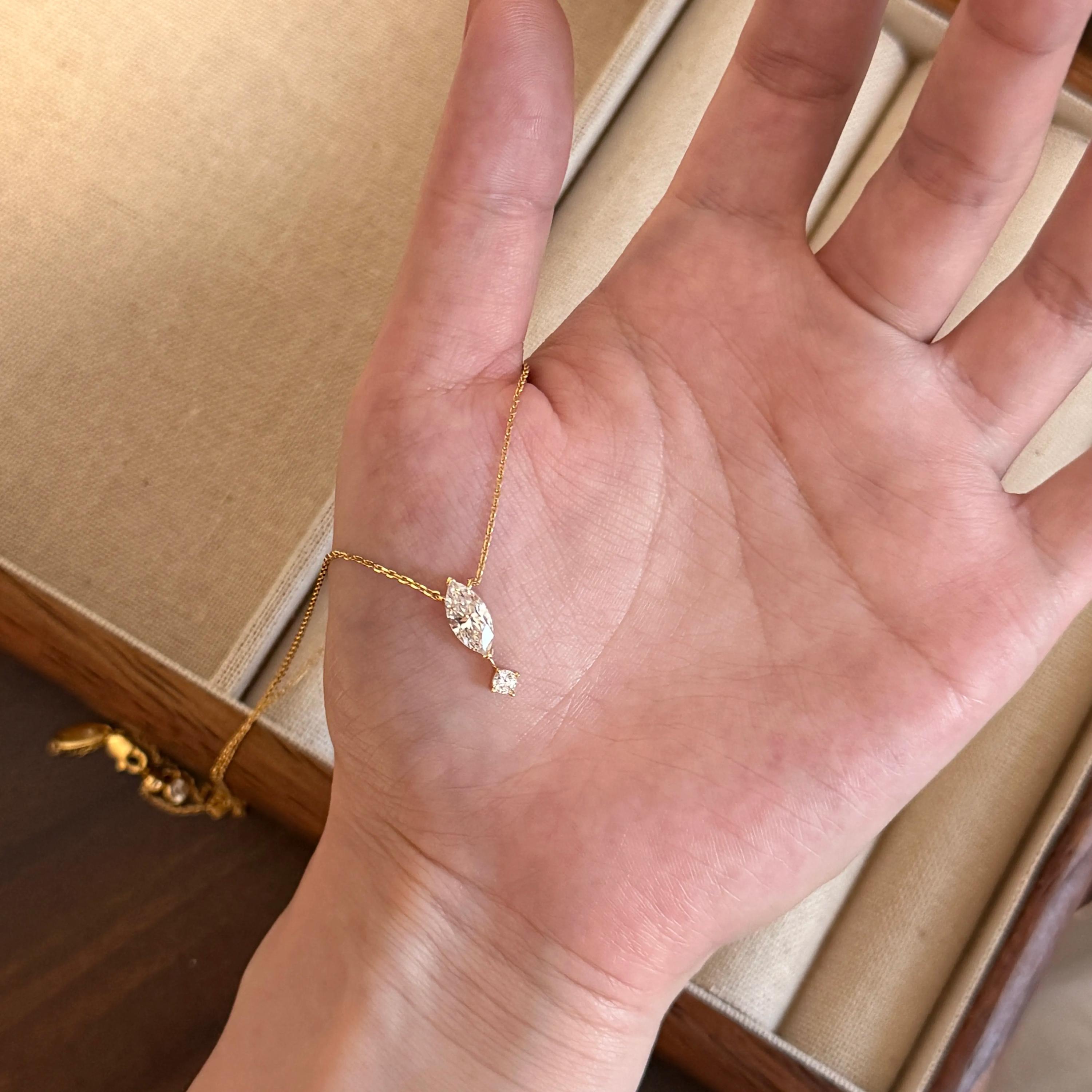 1. Design Concept Inspired by the poetic "suspended teardrop," the necklace features a 5*10mm marquise-cut main stone (1.25ct visual effect) paired with a tiny round diamond underneath, mimicking a tear frozen in mid-air. Minimalist lines blend modern aesthetics, turning every wear into a silent expression of emotion.